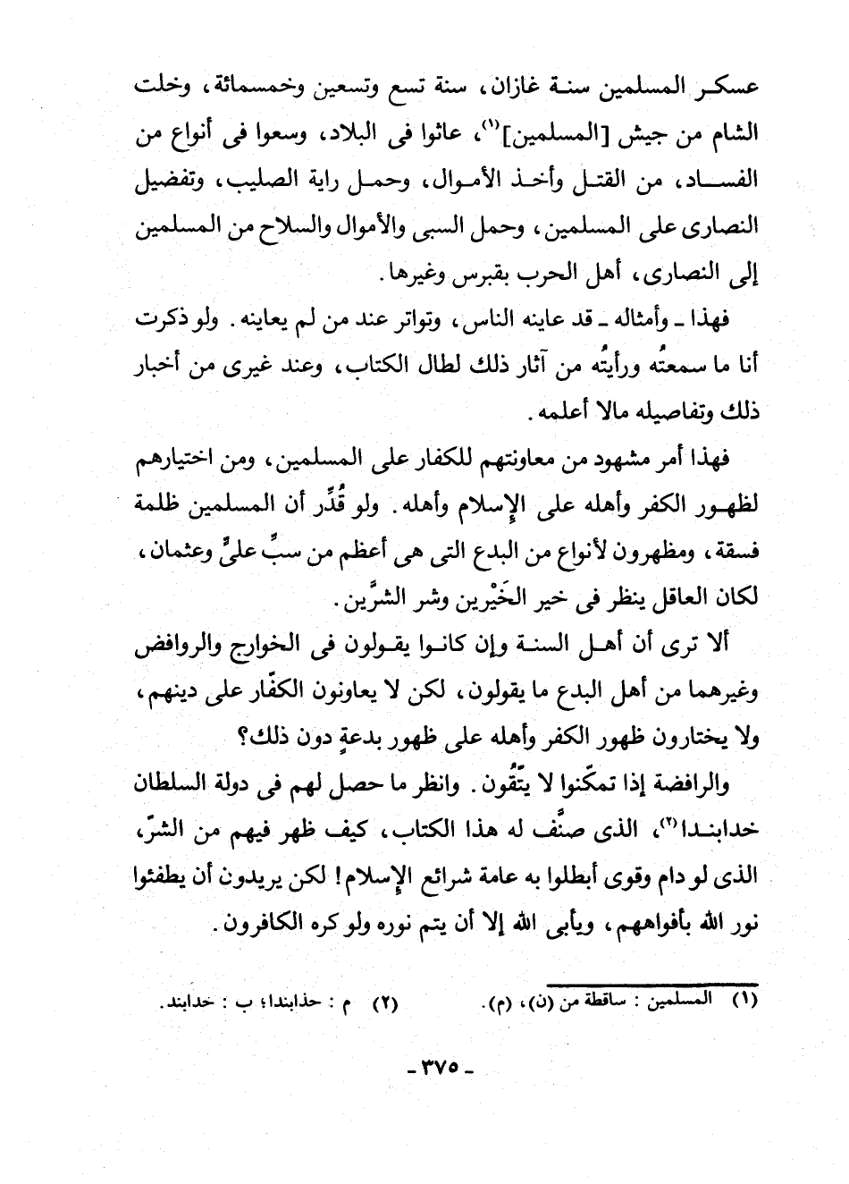 أَلَا تَرَى أَنَّ أَهْلَ السُّنَّةِ وَإِنْ كَانُوا يَقُولُونَ فِي الْخَوَارِجِ وَالرَّوَافِضِ وَغَيْرِهِمَا مِنْ أَهْلِ الْبِدَعِ مَا يَقُولُونَ، لَكِنْ لَا يُعَاوِنُونَ الْكُفَّارَ عَلَى دِينِهِمْ، وَلَا يَخْتَارُونَ ظُهُورَ الْكُفْرِ وَأَهْلِهِ عَلَى ظُهُورِ بِدْعَةٍ دُونَ ذَلِكَ؟ .