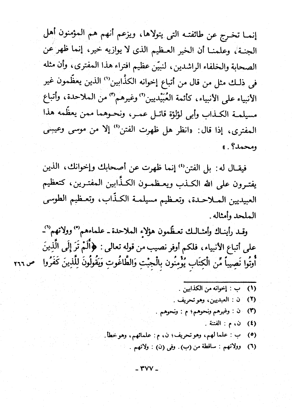 فَيُقَالُ لَهُ: بَلِ الْفِتَنُ (¬5) إِنَّمَا ظَهَرَتْ عَنْ أَصْحَابِكَ وَإِخْوَانِكَ، الَّذِينَ يَفْتَرُونَ عَلَى اللَّهِ الْكَذِبَ وَيُعَظِّمُونَ الْكَذَّابِينَ الْمُفْتَرِينَ، كَتَعْظِيمِ الْعُبَيْدِيِّينَ الْمَلَاحِدَةِ وَتَعْظِيمِ مُسَيْلِمَةَ الْكَذَّابِ، وَتَعْظِيمِ الطُّوسِيِّ الْمُلْحِدِ وَأَمْثَالِهِ.