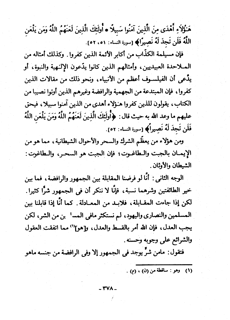 فَإِنَّ مُسَيْلِمَةَ الْكَذَّابَ مِنْ أَكَابِرِ الْأَئِمَّةِ الَّذِينَ كَفَرُوا. وَكَذَلِكَ أَمْثَالُهُ مِنَ الْمَلَاحِدَةِ الْعُبَيْدِيِّينَ، وَأَمْثَالُهُمُ الَّذِينَ كَانُوا يَدَّعُونَ الْإِلَهِيَّةَ وَالنُّبُوَّةَ، أَوْ يَدَّعِي أَنَّ الْفَيْلَسُوفَ أَعْظَمُ مِنَ الْأَنْبِيَاءِ، وَنَحْوُ ذَلِكَ مِنْ مَقَالَاتِ الَّذِينَ كَفَرُوا، فَإِنَّ الْمُبْتَدِعَةَ مِنَ الْجَهْمِيَّةِ وَالرَّافِضَةِ وَغَيْرِهِمُ الَّذِينَ أُوتُوا نَصِيبًا مِنَ الْكِتَابِ، يَقُولُونَ لِلَّذِينَ كَفَرُوا هَؤُلَاءِ أَهْدَى مِنَ الَّذِينَ آمَنُوا سَبِيلًا، فَيَحِقُّ عَلَيْهِمْ مَا وَعَدَ اللَّهُ بِهِ حَيْثُ قَالَ: {أُولَئِكَ الَّذِينَ لَعَنَهُمُ اللَّهُ وَمَنْ يَلْعَنِ اللَّهُ فَلَنْ تَجِدَ لَهُ نَصِيرًا} [سُورَةُ النِّسَاءِ: 52] .