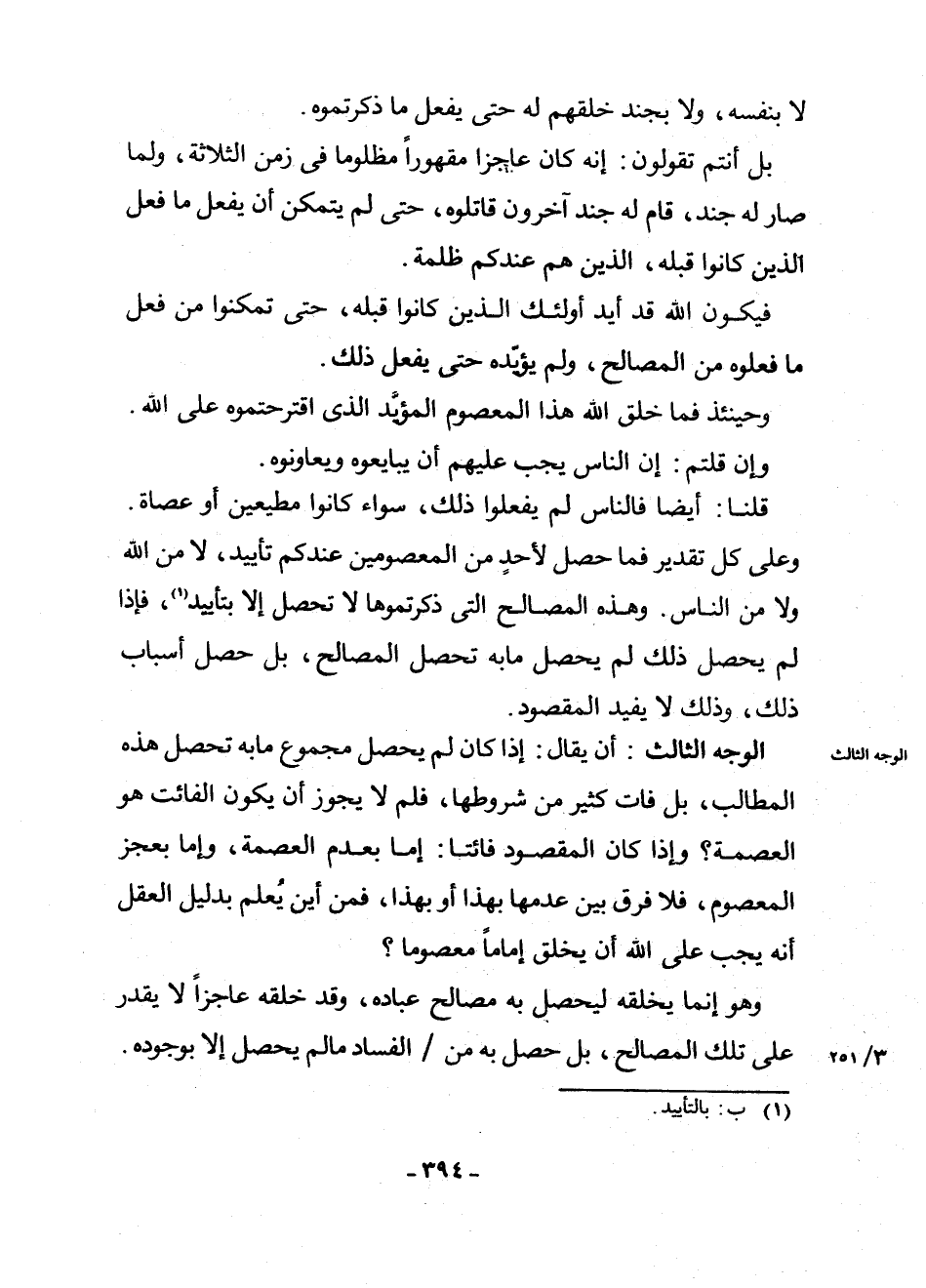 الْوَجْهُ الثَّالِثُ: أَنْ يُقَالَ: إِذَا كَانَ لَمْ يَحْصُلْ مَجْمُوعُ مَا بِهِ تَحْصُلُ هَذِهِ الْمَطَالِبُ، بَلْ فَاتَ كَثِيرٌ مِنْ شُرُوطِهَا، فَلِمَ لَا يَجُوزُ أَنْ يَكُونَ الْفَائِتُ هُوَ الْعِصْمَةَ؟ وَإِذَا كَانَ الْمَقْصُودُ فَائِتًا: إِمَّا بِعَدَمِ الْعِصْمَةِ، وَإِمَّا بِعَجْزِ الْمَعْصُومِ، فَلَا فَرْقَ بَيْنَ عَدَمِهَا بِهَذَا أَوْ بِهَذَا، فَمِنْ أَيْنَ يُعْلَمُ بِدَلِيلِ الْعَقْلِ أَنَّهُ يَجِبُ عَلَى اللَّهِ أَنْ يَخْلُقَ إِمَامًا مَعْصُومًا؟ .