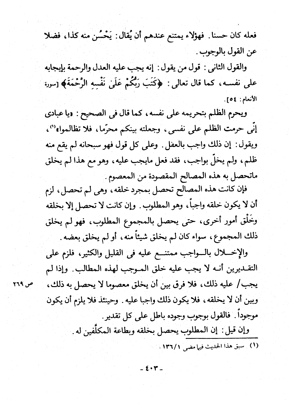 وَالْإِخْلَالُ بِالْوَاجِبِ مُمْتَنِعٌ عَلَيْهِ فِي الْقَلِيلِ وَالْكَثِيرِ، فَلَزِمَ عَلَى التَّقْدِيرَيْنِ أَنَّهُ لَا يَجِبُ عَلَيْهِ خَلْقُ الْمُوجِبِ لِهَذِهِ الْمَطَالِبِ؛ وَإِذَا لَمْ يَجِبْ عَلَيْهِ ذَلِكَ، فَلَا فَرْقَ بَيْنَ أَنْ يَخْلُقَ مَعْصُومًا لَا يَحْصُلُ بِهِ ذَلِكَ، وَبَيْنَ أَنْ لَا يَخْلُقَهُ، فَلَا يَكُونُ ذَلِكَ وَاجِبًا عَلَيْهِ. وَحِينَئِذٍ فَلَا يَلْزَمُ أَنْ يَكُونَ مَوْجُودًا. فَالْقَوْلُ بِوُجُوبِ وُجُودِهِ بَاطِلٌ عَلَى كُلِّ تَقْدِيرٍ.