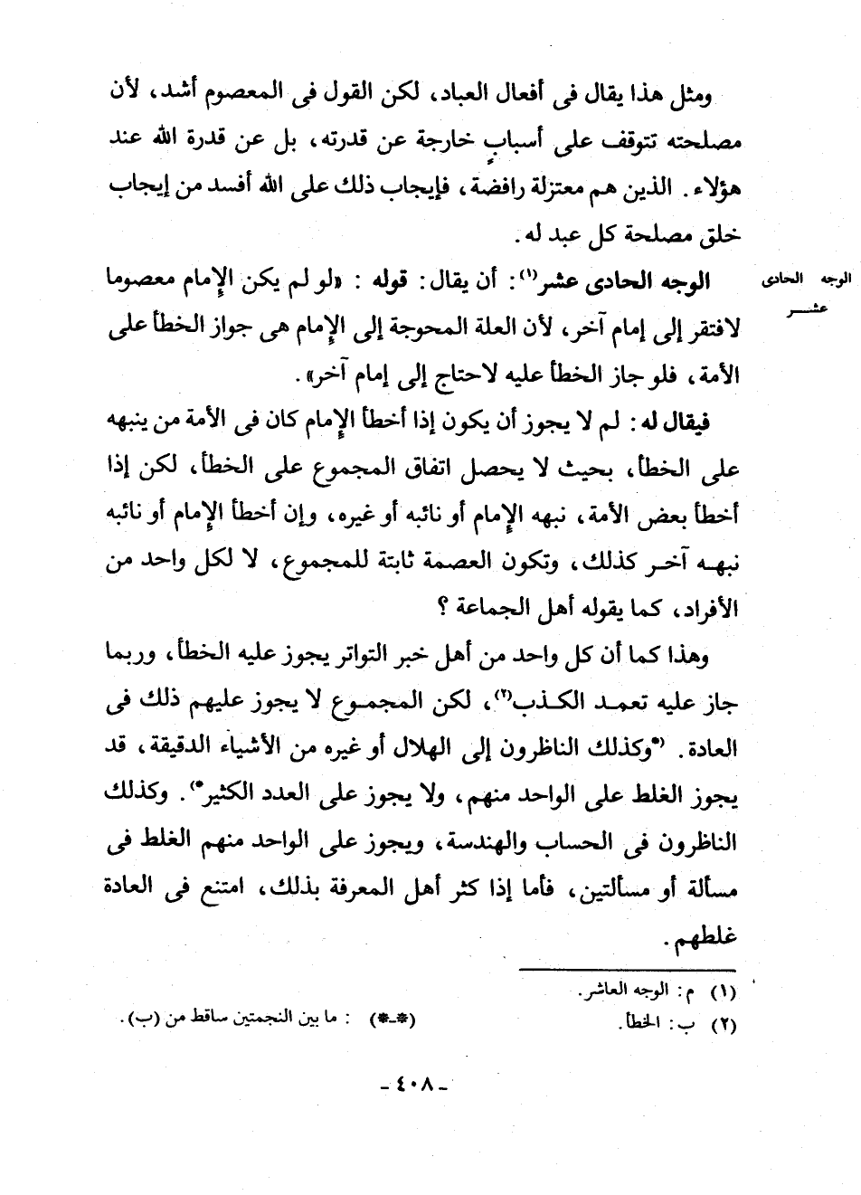 الْوَجْهُ الْحَادِي عَشَرَ (¬1) : أَنْ يُقَالَ: قَوْلُهُ: " لَوْ لَمْ يَكُنِ الْإِمَامُ مَعْصُومًا لَافْتَقَرَ إِلَى إِمَامٍ آخَرَ ; لَأَنَّ الْعِلَّةَ الْمُحْوِجَةَ إِلَى الْإِمَامِ هِيَ جَوَازُ الْخَطَأِ عَلَى الْأُمَّةِ، فَلَوْ جَازَ الْخَطَأُ عَلَيْهِ لَاحْتَاجَ إِلَى إِمَامٍ آخَرَ ".