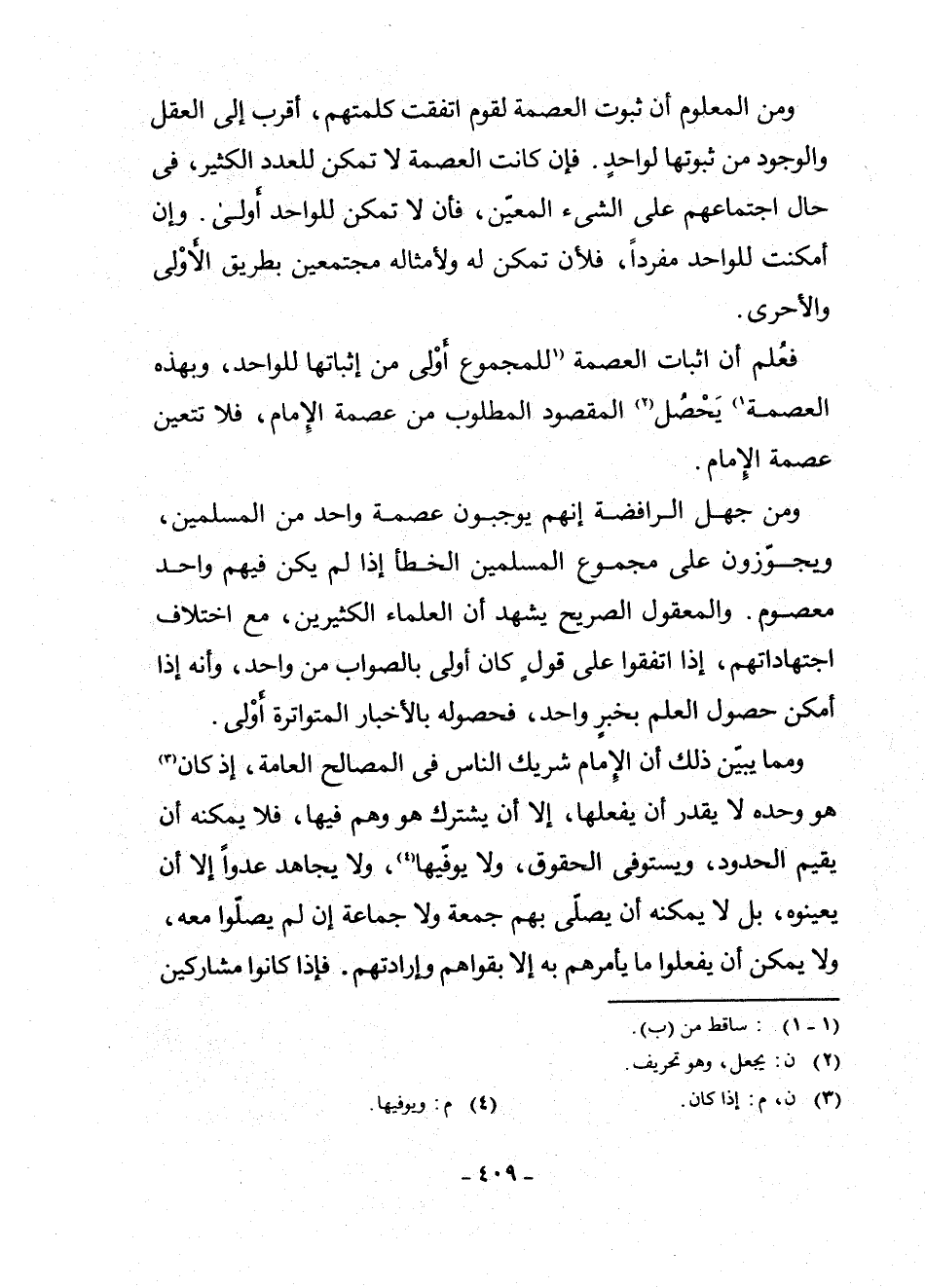 فَعُلِمَ أَنَّ إِثْبَاتَ الْعِصْمَةِ لِلْمَجْمُوعِ أَوْلَى مِنْ إِثْبَاتِهَا لِلْوَاحِدِ، وَبِهَذِهِ الْعِصْمَةِ (¬1) يَحْصُلُ (¬2) الْمَقْصُودُ الْمَطْلُوبُ مِنْ عِصْمَةِ الْإِمَامِ، فَلَا تَتَعَيَّنُ عِصْمَةُ الْإِمَامِ.