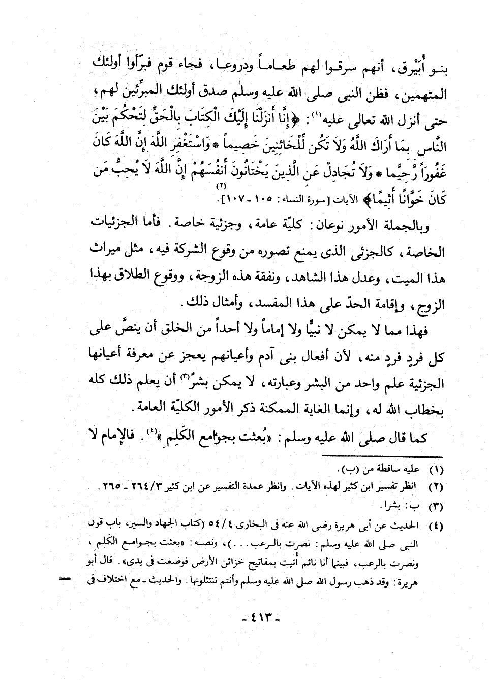 (¬4) الْحَدِيثَ عَنْ أَبِي هُرَيْرَةَ رَضِيَ اللَّهُ عَنْهُ فِي الْبُخَارِيِّ 4/54 كِتَابُ الْجِهَادِ وَالسِّيَرِ، بَابُ قَوْلِ النَّبِيِّ صَلَّى اللَّهُ عَلَيْهِ وَسَلَّمَ: نُصِرْتُ بِالرُّعْبِ، وَنَصُّهُ: بُعِثْتُ بِجَوَامِعِ الْكَلِمِ، وَنُصِرْتُ بِالرُّعْبِ، فَبَيْنَمَا أَنَا نَائِمٌ أُتِيتُ بِمَفَاتِيحِ خَزَائِنِ الْأَرْضِ فَوُضِعَتْ فِي يَدِي، قَالَ أَبُو هُرَيْرَةَ: وَقَدْ ذَهَبَ رَسُولُ اللَّهِ صَلَّى اللَّهُ عَلَيْهِ وَسَلَّمَ وَأَنْتُمْ تَنْتَثِلُونَهَا. وَالْحَدِيثُ مَعَ اخْتِلَافٍ فِي الْأَلْفَاظِ فِي الْبُخَارِيِّ 9/36 - 37 كِتَابُ التَّعْبِيرِ بَابُ الْمَفَاتِيحِ فِي الْيَدِ، 9/91 - 92 كِتَابُ الِاعْتِصَامِ بِالْكِتَابِ وَالسُّنَّةِ، بَابُ قَوْلِ النَّبِيِّ صَلَّى اللَّهُ عَلَيْهِ وَسَلَّمَ بُعِثْتُ بِجَوَامِعِ الْكَلِمِ، مُسْلِمٍ 1/371 - 372 كِتَابُ الْمَسَاجِدِ وَمَوَاضِعِ الصَّلَاةِ، أَوَّلُ الْكِتَابِ، سُنَنِ النَّسَائِيِّ 6/3 - 4 كِتَابُ الْجِهَادِ، أَوَّلُ الْكِتَابِ، الْمُسْنَدِ ط. الْمَعَارِفِ 14/20 - 53، وَقَوْلُ أَبِي هُرَيْرَةَ: وَأَنْتُمْ تَنْتَثِلُونَهَا: أَيْ تَسْتَخْرِجُونَهَا، وَالضَّمِيرُ هُنَا يُرَادُ بِهِ الْأَمْوَالُ وَمَا فُتِحَ عَلَيْهِمْ مِنْ زَهْرَةِ الدُّنْيَا.