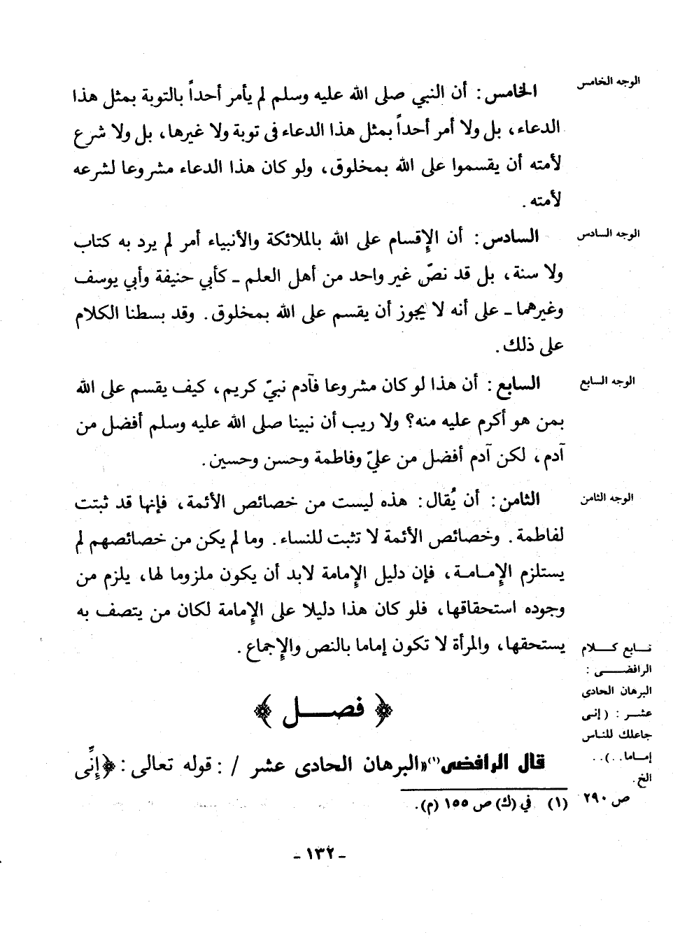 الْخَامِسُ: أَنَّ النَّبِيَّ - صَلَّى اللَّهُ عَلَيْهِ وَسَلَّمَ - لَمْ يَأْمُرْ أَحَدًا بِالتَّوْبَةِ بِمِثْلِ هَذَا الدُّعَاءِ، بَلْ وَلَا أَمَرَ أَحَدًا بِمِثْلِ هَذَا الدُّعَاءِ فِي تَوْبَةٍ وَلَا غَيْرِهَا، بَلْ وَلَا شَرَّعَ لِأُمَّتِهِ أَنْ يُقْسِمُوا عَلَى اللَّهِ بِمَخْلُوقٍ وَلَوْ كَانَ هَذَا الدُّعَاءُ مَشْرُوعًا لِشَرْعِهِ لِأُمَّتِهِ. السَّادِسُ: أَنَّ الْإِقْسَامَ عَلَى اللَّهِ بِالْمَلَائِكَةِ وَالْأَنْبِيَاءِ أَمْرٌ لَمْ يَرِدْ بِهِ كِتَابٌ وَلَا سُنَّةٌ، بَلْ قَدْ نَصَّ غَيْرُ وَاحِدٍ مِنْ أَهْلِ الْعِلْمِ - كَأَبِي حَنِيفَةَ وَأَبِي يُوسُفَ وَغَيْرِهِمَا - عَلَى أَنَّهُ لَا يَجُوزُ أَنْ يُقْسَمَ عَلَى اللَّهِ بِمَخْلُوقٍ. وَقَدْ بَسَطْنَا الْكَلَامَ عَلَى ذَلِكَ. السَّابِعُ: أَنَّ هَذَا لَوْ كَانَ مَشْرُوعًا فَآدَمُ نَبِيٌّ كَرِيمٌ، كَيْفَ يُقْسِمُ عَلَى اللَّهِ بِمَنْ هُوَ أَكْرَمُ عَلَيْهِ مِنْهُ؟ وَلَا رَيْبَ أَنَّ نَبِيَّنَا - صَلَّى اللَّهُ عَلَيْهِ وَسَلَّمَ - أَفْضَلُ مِنْ آدَمَ، لَكِنَّ آدَمَ أَفْضَلُ مِنْ عَلِيٍّ وَفَاطِمَةَ وَحَسَنٍ وَحُسَيْنٍ. الثَّامِنُ: أَنْ يُقَالَ: هَذِهِ لَيْسَتْ مِنْ خَصَائِصِ الْأَئِمَّةِ، فَإِنَّهَا قَدْ ثَبَتَتْ لِفَاطِمَةَ. وَخَصَائِصُ الْأَئِمَّةِ لَا تَثْبُتُ لِلنِّسَاءِ. وَمَا لَمْ يَكُنْ مِنْ خَصَائِصِهِمْ لَمْ يَسْتَلْزِمِ الْإِمَامَةَ، فَإِنَّ دَلِيلَ الْإِمَامَةِ لَا بُدَّ أَنْ يَكُونَ مَلْزُومًا لَهَا، يَلْزَمُ مِنْ وُجُودِهِ اسْتِحْقَاقُهَا، فَلَوْ كَانَ هَذَا دَلِيلًا عَلَى الْإِمَامَةِ لَكَانَ مَنْ يَتَّصِفُ بِهِ يَسْتَحِقُّهَا، وَالْمَرْأَةُ لَا تَكُونُ إِمَامًا بِالنَّصِّ وَالْإِجْمَاعِ.