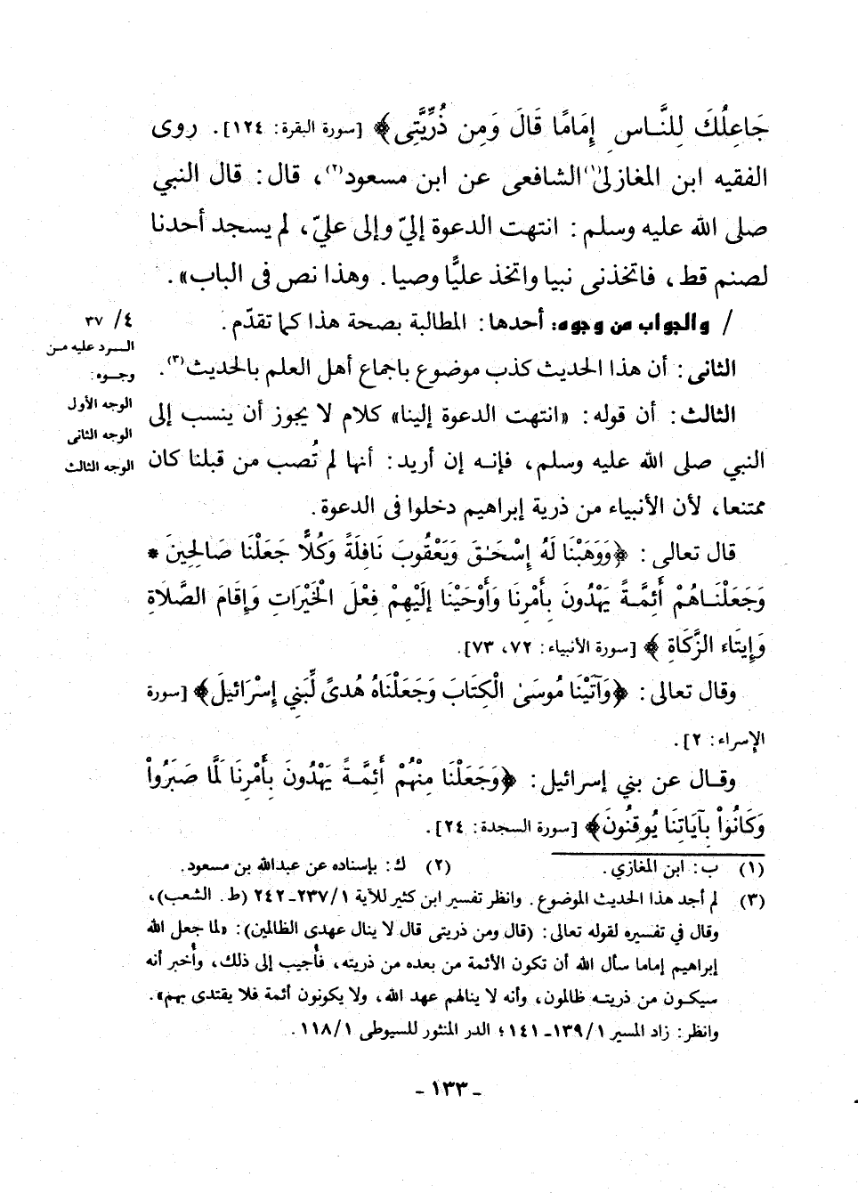 (¬3) بِالْحَدِيثِ لَمْ أَجِدْ هَذَا الْحَدِيثَ الْمَوْضُوعَ، وَانْظُرْ تَفْسِيرَ ابْنِ كَثِيرٍ لِلْآيَةِ " 1 \ \ 237 237 - 242 " ط. الشَّعْبِ "، وَقَالَ فِي تَفْسِيرِهِ لِقَوْلِهِ تَعَالَى: قَالَ وَمِنْ ذُرِّيَّتِي قَالَ لَا يَنَالُ عَهْدِي الظَّالِمِينَ " لَمَّا جَعَلَ اللَّهُ إِبْرَاهِيمَ إِمَامًا سَأَلَ اللَّهَ أَنْ تَكُونَ الْأَئِمَّةُ مِنْ بَعْدِهِ مِنْ ذُرِّيَّتِهِ، فَأُجِيبَ إِلَى ذَلِكَ، وَأُخْبِرَ أَنَّهُ سَيَكُونُ مِنْ ذُرِّيَّتِهِ ظَالِمُونَ، وَأَنَّهُ لَا يَنَالُهُمْ عَهْدُ اللَّهِ، وَلَا يَكُونُونَ أَئِمَّةً فَلَا يُقْتَدَى بِهِمْ "