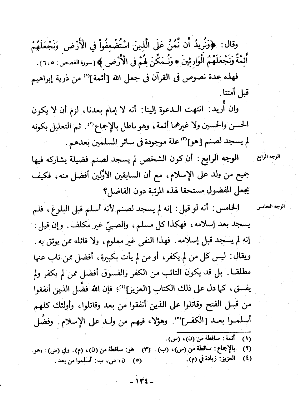 وَقَالَ: {وَنُرِيدُ أَنْ نَمُنَّ عَلَى الَّذِينَ اسْتُضْعِفُوا فِي الْأَرْضِ وَنَجْعَلَهُمْ أَئِمَّةً وَنَجْعَلَهُمُ الْوَارِثِينَ وَنُمَكِّنَ لَهُمْ فِي الْأَرْضِ} [سُورَةُ الْقَصَصِ: 5، 6] . فَهَذِهِ عِدَّةُ نُصُوصٍ مِنَ الْقُرْآنِ فِي جَعْلِ اللَّهِ [أَئِمَّةً] (¬1) مِنْ ذُرِّيَّةِ إِبْرَاهِيمَ قَبْلَ أُمَّتِنَا. وَإِنْ أُرِيدَ: انْتَهَتِ الدَّعْوَةُ إِلَيْنَا: أَنَّهُ لَا إِمَامَ بَعْدَنَا، لَزِمَ أَنْ لَا يَكُونَ الْحَسَنُ وَالْحُسَيْنُ وَلَا غَيْرُهُمَا أَئِمَّةً، وَهُوَ بَاطِلٌ بِالْإِجْمَاعِ (¬2) . ثُمَّ التَّعْلِيلُ بِكَوْنِهِ لَمْ يَسْجُدْ لِصَنَمٍ [هُو] (¬3) هُوَ عِلَّةٌ مَوْجُودَةٌ فِي سَائِرِ الْمُسْلِمِينَ بَعْدَهُمْ. الْوَجْهُ الرَّابِعُ: أَنَّ كَوْنَ الشَّخْصِ لَمْ يَسْجُدْ لِصَنَمٍ فَضِيلَةٌ يُشَارِكُهُ فِيهَا جَمِيعُ مَنْ وُلِدَ عَلَى الْإِسْلَامِ، مَعَ أَنَّ السَّابِقِينَ الْأَوَّلِينَ أَفْضَلُ مِنْهُ، فَكَيْفَ يُجْعَلُ الْمَفْضُولُ مُسْتَحِقًّا لِهَذِهِ الْمَرْتَبَةِ دُونَ الْفَاضِلِ؟ الْخَامِسُ: أَنَّهُ لَوْ قِيلَ أَنَّهُ لَمْ يَسْجُدْ لِصَنَمٍ لِأَنَّهُ أَسْلَمَ قَبْلَ الْبُلُوغِ، فَلَمْ يَسْجُدْ بَعْدَ إِسْلَامِهِ، فَهَكَذَا كَلُّ مُسْلِمٍ، وَالصَّبِيُّ غَيْرُ مُكَلَّفٍ. وَإِنْ قِيلَ: إِنَّهُ لَمْ يَسْجُدْ قَبْلَ إِسْلَامِهِ فَهَذَا النَّفْيُ غَيْرُ مَعْلُومٍ، وَلَا قَائِلُهُ مِمَّنْ يُوثَقُ بِهِ. وَيُقَالُ: لَيْسَ كُلُّ مَنْ لَمْ يَكْفُرْ أَوْ مَنْ لَمْ يَأْتِ بِكَبِيرَةٍ أَفْضَلُ مِمَّنْ تَابَ عَنْهَا مُطْلَقًا بَلْ قَدْ يَكُونُ التَّائِبُ مِنَ الْكُفْرِ وَالْفُسُوقِ أَفْضَلَ مِمَّنْ لَمْ يَكْفُرْ وَلَمْ يَفْسُقْ، كَمَا دَلَّ عَلَى ذَلِكَ الْكِتَابُ [الْعَزِيزُ] (¬4) فَإِنَّ اللَّهَ فَضَّلَ الَّذِينَ أَنْفَقُوا مِنْ قَبْلِ الْفَتْحِ وَقَاتَلُوا عَلَى الَّذِينَ أَنْفَقُوا مِنْ بَعْدُ وَقَاتَلُوا، وَأُولَئِكَ كُلُّهُمْ أَسْلَمُوا بَعْدَ [الْكُفْرِ] (¬5) . وَهَؤُلَاءِ فِيهِمْ مَنْ وُلِدَ عَلَى الْإِسْلَامِ. وَفَضَّلَ