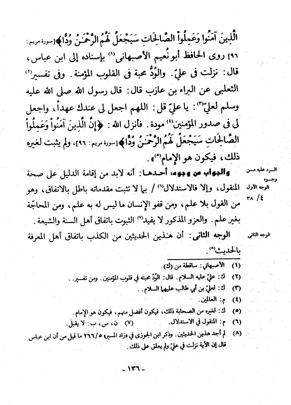 [سُورَةُ مَرْيَمَ: 96] رَوَى الْحَافِظُ أَبُو نُعَيْمٍ الْأَصْبَهَانِيُّ (¬1) بِإِسْنَادِهِ إِلَى ابْنِ عَبَّاسٍ قَالَ نَزَلَتْ فِي عَلَيٍّ. وَالْوُدُّ مَحَبَّةٌ فِي الْقُلُوبِ الْمُؤْمِنَةِ. وَفِي تَفْسِيرِ (¬2) الثَّعْلَبِيِّ عَنِ الْبَرَاءِ بْنِ عَازِبٍ قَالَ: «قَالَ رَسُولُ اللَّهِ - صَلَّى اللَّهُ عَلَيْهِ وَسَلَّمَ - لِعَلِيٍّ (¬3) : يَا عَلِيُّ قُلْ: اللَّهُمَّ اجْعَلْ لِي عِنْدَكَ عَهْدًا، وَاجْعَلْ لِي فِي صُدُورِ الْمُؤْمِنِينَ (¬4) مَوَدَّةً. فَأَنْزَلَ اللَّهُ: {إِنَّ الَّذِينَ آمَنُوا وَعَمِلُوا الصَّالِحَاتِ سَيَجْعَلُ لَهُمُ الرَّحْمَنُ وُدًّا} » [سُورَةُ مَرْيَمَ: 96] ، وَلَمْ يَثْبُتْ لِغَيْرِهِ ذَلِكَ، فَيَكُونُ هُوَ الْإِمَامَ (¬5) ". وَالْجَوَابُ مِنْ وُجُوهٍ: أَحَدُهَا: أَنَّهُ لَا بُدَّ مِنْ إِقَامَةِ الدَّلِيلِ عَلَى صِحَّةِ الْمَنْقُولِ، وَإِلَّا فَالِاسْتِدْلَالُ (¬6) بِمَا لَا تَثْبُتُ مُقَدِّمَاتُهُ بَاطِلٌ بِالِاتِّفَاقِ، وَهُوَ مِنَ الْقَوْلِ بِلَا عِلْمٍ وَمِنْ قَفْوِ الْإِنْسَانِ بِمَا لَيْسَ لَهُ بِهِ عِلْمٌ، وَمِنَ الْمُحَاجَّةِ بِغَيْرِ عِلْمٍ. وَالْعَزْوُ الْمَذْكُورُ لَا يُفِيدُ (¬7) الثُّبُوتَ بِاتِّفَاقِ أَهْلِ السُّنَّةِ وَالشِّيعَةِ. الْوَجْهُ الثَّانِي: أَنَّ هَذَيْنِ الْحَدِيثَيْنِ مِنَ الْكَذِبِ بِاتِّفَاقِ أَهْلِ الْمَعْرِفَةِ بِالْحَدِيثِ (¬8) .