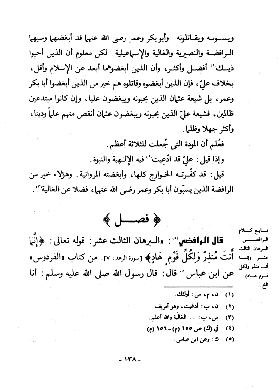 قَالَ الرَّافِضِيُّ (¬4) : " الْبُرْهَانُ الثَّالِثَ عَشَرَ: قَوْلُهُ تَعَالَى: {إِنَّمَا أَنْتَ مُنْذِرٌ وَلِكُلِّ قَوْمٍ هَادٍ} [سُورَةُ الرَّعْدِ: 7] مِنْ كِتَابِ " الْفِرْدَوْسِ " عَنِ ابْنِ عَبَّاسٍ (¬5) قَالَ: قَالَ رَسُولُ اللَّهِ - صَلَّى اللَّهُ عَلَيْهِ وَسَلَّمَ -: «أَنَا