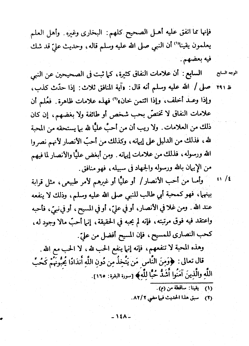 السَّابِعُ: أَنَّ عَلَامَاتِ النِّفَاقِ كَثِيرَةٌ، كَمَا ثَبَتَ فِي الصَّحِيحَيْنِ عَنِ النَّبِيِّ - صَلَّى اللَّهُ عَلَيْهِ وَسَلَّمَ - أَنَّهُ قَالَ: «آيَةُ الْمُنَافِقِ ثَلَاثٌ: إِذَا حَدَّثَ كَذَبَ، وَإِذَا وَعَدَ أَخْلَفَ، وَإِذَا ائْتُمِنَ خَانَ» (¬2) . فَهَذِهِ عَلَامَاتٌ ظَاهِرَةٌ. فَعُلِمَ أَنَّ عَلَامَاتِ النِّفَاقِ لَا تَخْتَصُّ بِحُبِّ شَخْصٍ أَوْ طَائِفَةٍ وَلَا بُغْضِهِمْ، إِنْ كَانَ ذَلِكَ مِنَ الْعَلَامَاتِ. وَلَا رَيْبَ أَنَّ مَنْ أَحَبَّ عَلِيًّا لِلَّهِ بِمَا يَسْتَحِقُّهُ مِنَ الْمَحَبَّةِ لِلَّهِ، فَذَلِكَ مِنَ الدَّلِيلِ عَلَى إِيمَانِهِ، وَكَذَلِكَ مَنْ أَحَبَّ الْأَنْصَارَ ; لِأَنَّهُمْ نَصَرُوا اللَّهَ وَرَسُولَهُ، فَذَلِكَ مِنْ عَلَامَاتِ إِيمَانِهِ، وَمَنْ أَبْغَضَ عَلِيًّا وَالْأَنْصَارَ لِمَا فِيهِمْ مِنَ الْإِيمَانِ بِاللَّهِ وَرَسُولِهِ وَالْجِهَادِ فِي سَبِيلِهِ ; فَهُوَ مُنَافِقٌ.