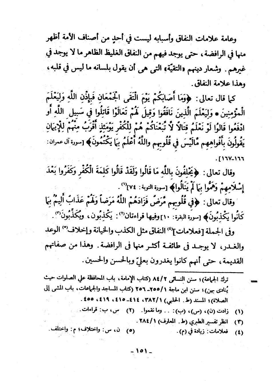 وَعَامَّةُ عَلَامَاتِ النِّفَاقِ وَأَسْبَابِهِ لَيْسَتْ فِي أَحَدٍ مِنْ أَصْنَافِ الْأُمَّةِ أَظْهَرَ مِنْهَا فِي الرَّافِضَةِ، حَتَّى يُوجَدَ فِيهِمْ مِنَ النِّفَاقِ الْغَلِيظِ الظَّاهِرِ مَا لَا يُوجَدُ فِي غَيْرِهِمْ. وَشِعَارُ دِينِهِمْ " التَّقِيَّةُ " الَّتِي هِيَ أَنْ يَقُولَ بِلِسَانِهِ مَا لَيْسَ فِي قَلْبِهِ، وَهَذَا عَلَامَةُ النِّفَاقِ.