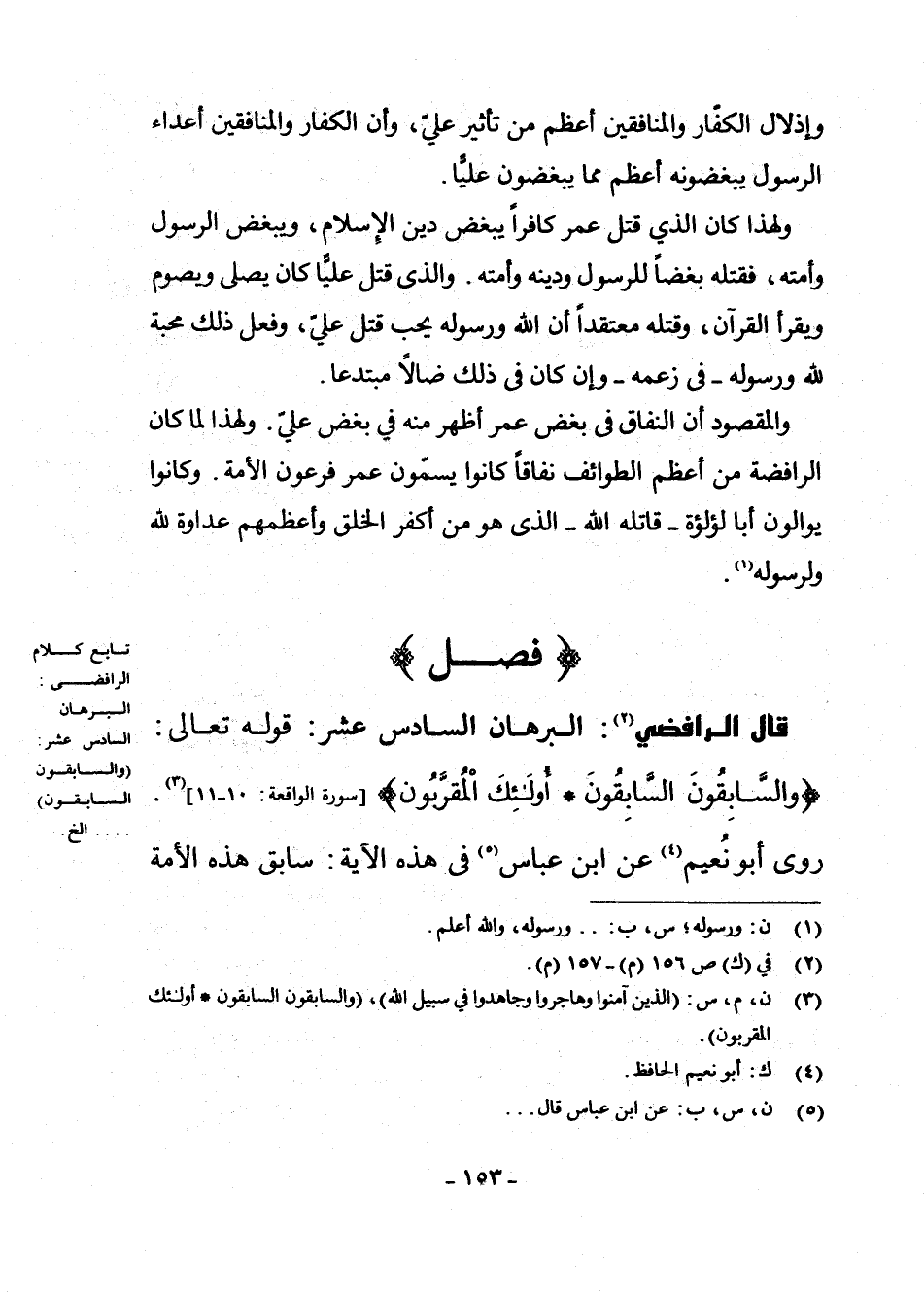 قَالَ الرَّافِضِيُّ (¬2) : الْبُرْهَانُ السَّادِسَ عَشَرَ: قَوْلُهُ تَعَالَى: {وَالسَّابِقُونَ السَّابِقُونَ - أُولَئِكَ الْمُقَرَّبُونَ} [سُورَةُ الْوَاقِعَةِ: 10 - 11] (¬3) . رَوَى أَبُو نُعَيْمٍ (¬4) عَنِ ابْنِ عَبَّاسٍ (¬5) فِي هَذِهِ الْآيَةِ: سَابِقُ هَذِهِ الْأُمَّةِ