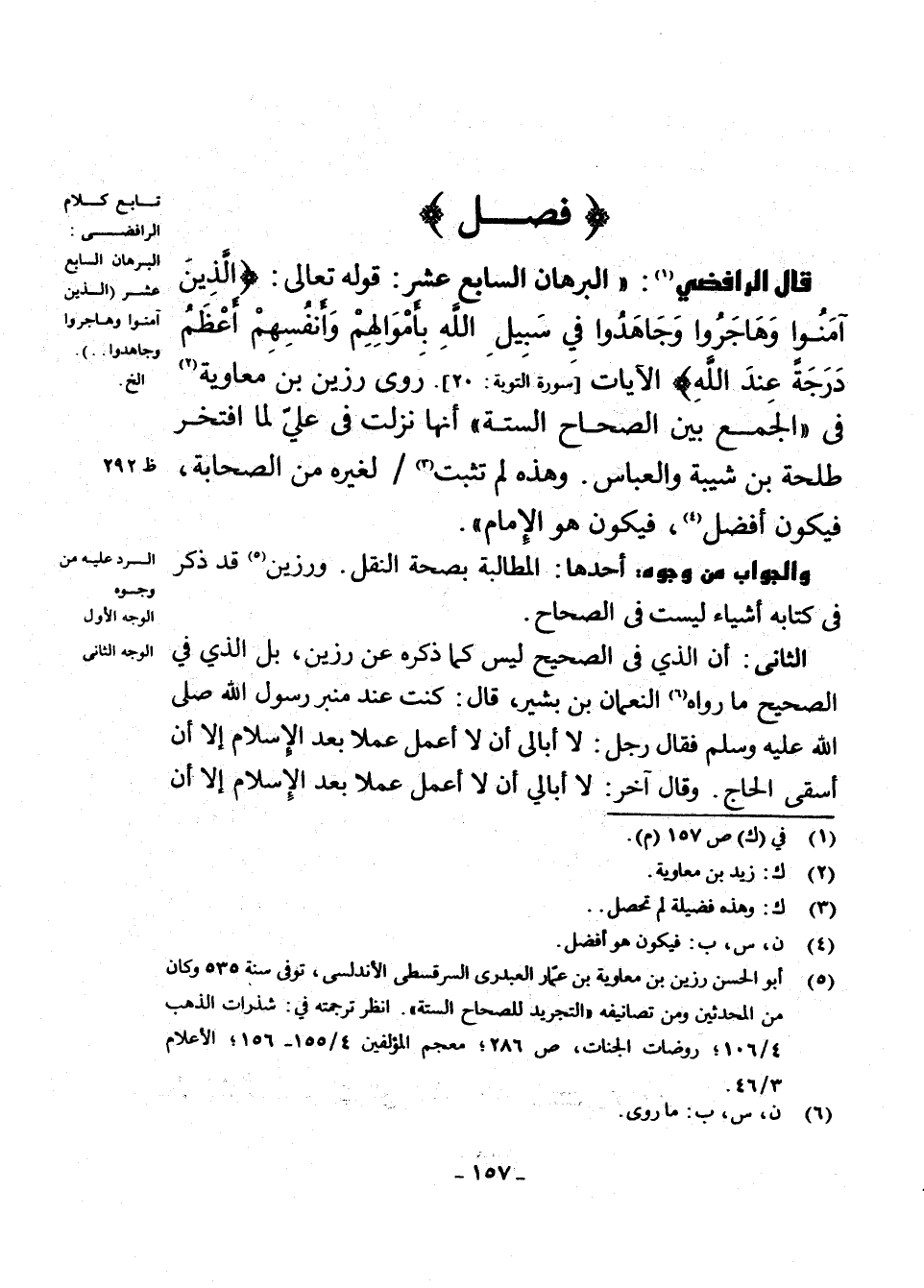 [فصل البرهان السابع عشر " الَّذِينَ آمَنُوا وَهَاجَرُوا وَجَاهَدُوا فِي سَبِيلِ اللَّهِ بِأَمْوَالِهِمْ وَأَنْفُسِهِمْ " والجواب عليه]