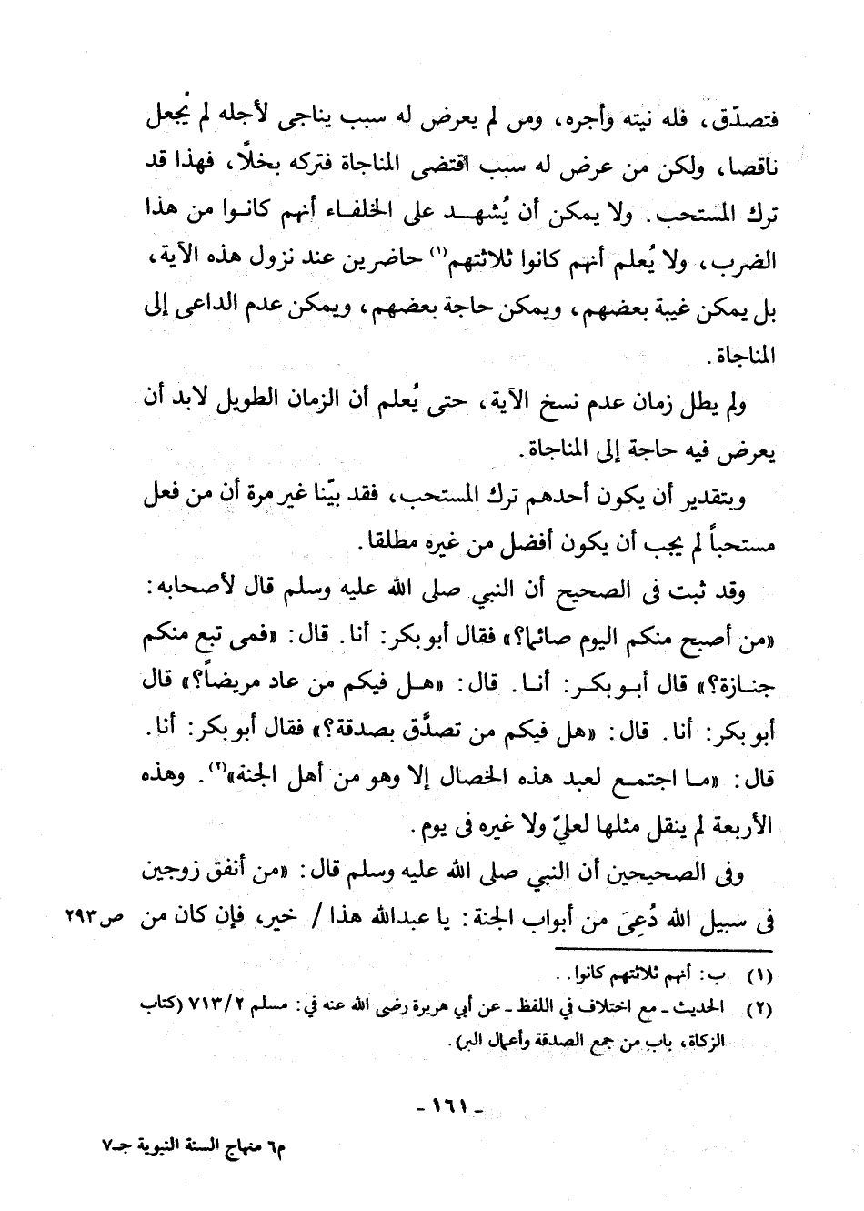 فَتَصَدَّقَ، فَلَهُ نِيَّتُهُ وَأَجْرُهُ، وَمَنْ لَمْ يَعْرِضْ لَهُ سَبَبٌ يُنَاجِي لِأَجْلِهِ لَمْ يُجْعَلْ نَاقِصًا، وَلَكِنْ مَنْ عَرَضَ لَهُ سَبَبٌ اقْتَضَى الْمُنَاجَاةَ فَتَرَكَهُ بُخْلًا، فَهَذَا قَدْ تَرَكَ الْمُسْتَحَبَّ. وَلَا يُمْكِنُ أَنْ يُشْهَدَ عَلَى الْخُلَفَاءِ أَنَّهُمْ كَانُوا مِنْ هَذَا الضَّرْبِ، وَلَا يُعْلَمُ أَنَّهُمْ كَانُوا ثَلَاثَتُهُمْ (¬1) حَاضِرِينَ عِنْدَ نُزُولِ هَذِهِ الْآيَةِ، بَلْ يُمْكِنُ غَيْبَةُ بَعْضِهِمْ، وَيُمْكِنُ حَاجَةُ بَعْضِهِمْ، وَيُمْكِنُ عَدَمُ الدَّاعِي إِلَى الْمُنَاجَاةِ.