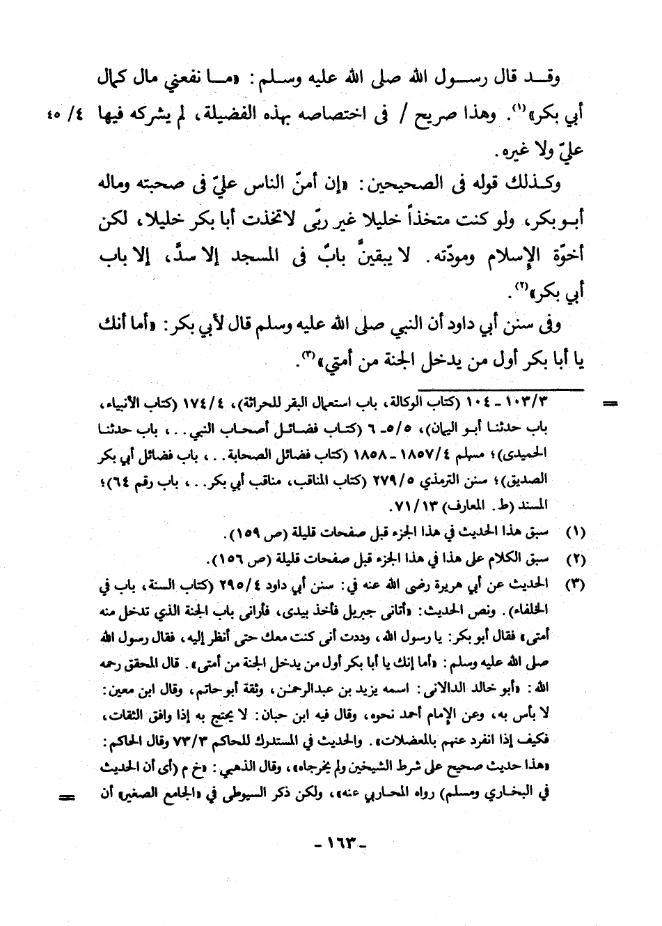 (¬3) الْحَدِيثُ عَنْ أَبِي هُرَيْرَةَ رَضِيَ اللَّهُ عَنْهُ فِي سُنَنِ أَبِي دَاوُدَ 4/295 (كِتَابُ السُّنَّةِ، بَابٌ فِي الْخُلَفَاءِ) ، وَنَصُّ الْحَدِيثِ: " أَتَانِي جِبْرِيلُ فَأَخَذَ بِيَدِي، فَأَرَانِي بَابَ الْجَنَّةِ الَّذِي تَدْخُلُ مِنْهُ أُمَّتِي ". فَقَالَ أَبُو بَكْرٍ: يَا رَسُولَ اللَّهِ، وَدِدْتُ أَنِّي كُنْتُ مَعَكَ حَتَّى أَنْظُرَ إِلَيْهِ، فَقَالَ رَسُولُ اللَّهِ صَلَّى اللَّهُ عَلَيْهِ وَسَلَّمَ: " أَمَا إِنَّكَ يَا أَبَا بَكْرٍ أَوَّلُ مَنْ يَدْخُلُ الْجَنَّةَ مِنْ أُمَّتِي ". قَالَ الْمُحَقِّقُ رَحِمَهُ اللَّهُ: " أَبُو خَالِدٍ الدَّالَانِيُّ: اسْمُهُ يَزِيدُ بْنُ عَبْدِ الرَّحْمَنِ، وَثَّقَهُ أَبُو حَاتِمٍ، وَقَالَ ابْنُ مَعِينٍ: لَا بَأْسَ بِهِ، وَعَنِ الْإِمَامِ أَحْمَدَ نَحْوُهُ، وَقَالَ فِيهِ ابْنُ حِبَّانَ: لَا يُحْتَجُّ بِهِ إِذَا وَافَقَ الثِّقَاتِ فَكَيْفَ إِذَا انْفَرَدَ عَنْهُمْ بِالْمُعْضِلَاتِ "، وَالْحَدِيثُ فِي الْمُسْتَدْرَكِ لِلْحَاكِمِ 3 وَقَالَ الْحَاكِمُ: " هَذَا حَدِيثٌ صَحِيحٌ عَلَى شَرْطِ الشَّيْخَيْنِ وَلَمْ يُخَرِّجَاهُ "، وَقَالَ الذَّهَبِيُّ: خ م (أَيْ أَنَّ الْحَدِيثَ فِي الْبُخَارِيِّ وَمُسْلِمٍ) ، رَوَاهُ الْمُحَارِبِيُّ عَنْهُ "، وَلَكِنْ ذَكَرَ السُّيُوطِيُّ فِي " الْجَامِعِ الصَّغِيرِ " أَنَّ الْحَدِيثَ فِي سُنَنِ أَبِي دَاوُدَ وَالْمُسْتَدْرَكِ، وَضَعَّفَ الْأَلْبَانِيُّ الْحَدِيثَ فِي " ضَعِيفِ الْجَامِعِ الصَّغِيرِ " 1/71.