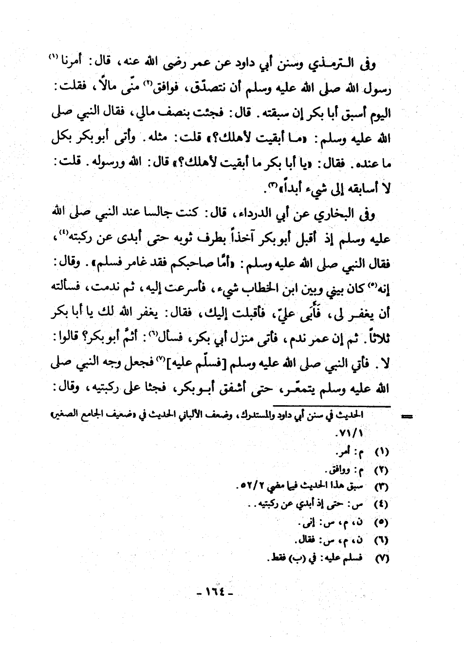 وَفِي التِّرْمِذِيِّ وَسُنَنِ أَبِي دَاوُدَ «عَنْ عُمَرَ - رَضِيَ اللَّهُ عَنْهُ -، قَالَ: أَمَرَنَا (¬1) رَسُولُ اللَّهِ - صَلَّى اللَّهُ عَلَيْهِ وَسَلَّمَ - أَنْ نَتَصَدَّقَ، فَوَافَقَ (¬2) مِنِّي مَالًا، فَقُلْتُ: الْيَوْمَ أَسْبِقُ أَبَا بَكْرٍ إِنْ سَبَقْتُهُ. قَالَ: فَجِئْتُ بِنِصْفِ مَالِي، فَقَالَ النَّبِيُّ - صَلَّى اللَّهُ عَلَيْهِ وَسَلَّمَ -: " مَا أَبْقَيْتَ لِأَهْلِكَ؟ " قُلْتُ: مِثْلُهُ. وَأَتَى أَبُو بَكْرٍ بِكُلِّ مَا عِنْدَهُ. فَقَالَ: " يَا أَبَا بَكْرٍ، مَا أَبْقَيْتَ لِأَهْلِكَ؟ " قَالَ: اللَّهُ وَرَسُولُهُ. قُلْتُ: لَا أُسَابِقُهُ إِلَى شَيْءٍ أَبَدًا» (¬3) .