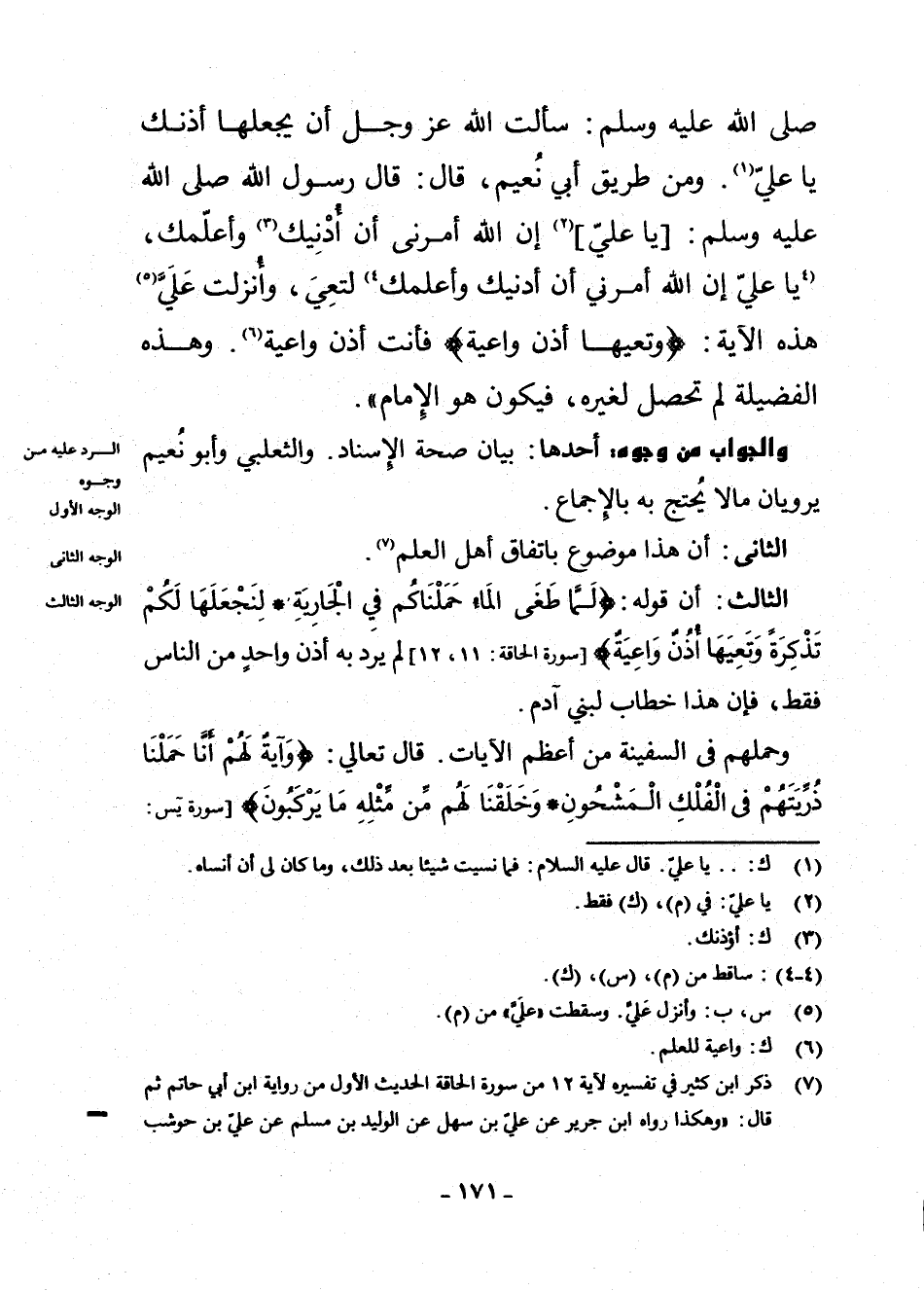 - صَلَّى اللَّهُ عَلَيْهِ وَسَلَّمَ -: سَأَلْتُ اللَّهَ - عَزَّ وَجَلَّ - أَنْ يَجْعَلَهَا أُذُنَكَ يَا عَلِيُّ» (¬1) . وَمِنْ طَرِيقِ أَبِي نُعَيْمٍ، قَالَ: «قَالَ رَسُولُ اللَّهِ - صَلَّى اللَّهُ عَلَيْهِ وَسَلَّمَ -: [يَا عَلِيُّ] (¬2) إِنَّ اللَّهَ أَمَرَنِي أَنْ أُدْنِيَكَ (¬3) وَأُعَلِّمَكَ، (¬4) يَا عَلِيُّ إِنَّ اللَّهَ أَمَرَنِي أَنْ أُدْنِيَكَ وَأُعَلِّمَكَ (¬5) لِتَعِيَ، وَأُنْزِلَتْ عَلَيَّ (¬6) هَذِهِ الْآيَةُ: {وَتَعِيَهَا أُذُنٌ وَاعِيَةٌ} فَأَنْتَ أُذُنٌ وَاعِيَةٌ» (¬7) . وَهَذِهِ الْفَضِيلَةُ لَمْ تَحْصُلْ لِغَيْرِهِ، فَيَكُونُ هُوَ الْإِمَامَ ".