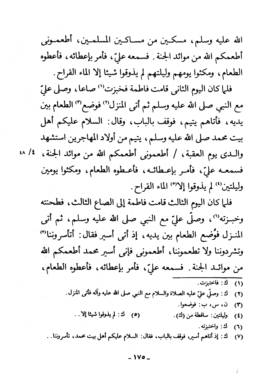 (¬7) ك: إِذْ أَتَاهُمْ أَسِيرٌ، فَوَقَفَ بِالْبَابِ، فَقَالَ: السَّلَامُ عَلَيْكُمْ أَهْلَ بَيْتِ مُحَمَّدٍ، تَأْسِرُونَنَا.