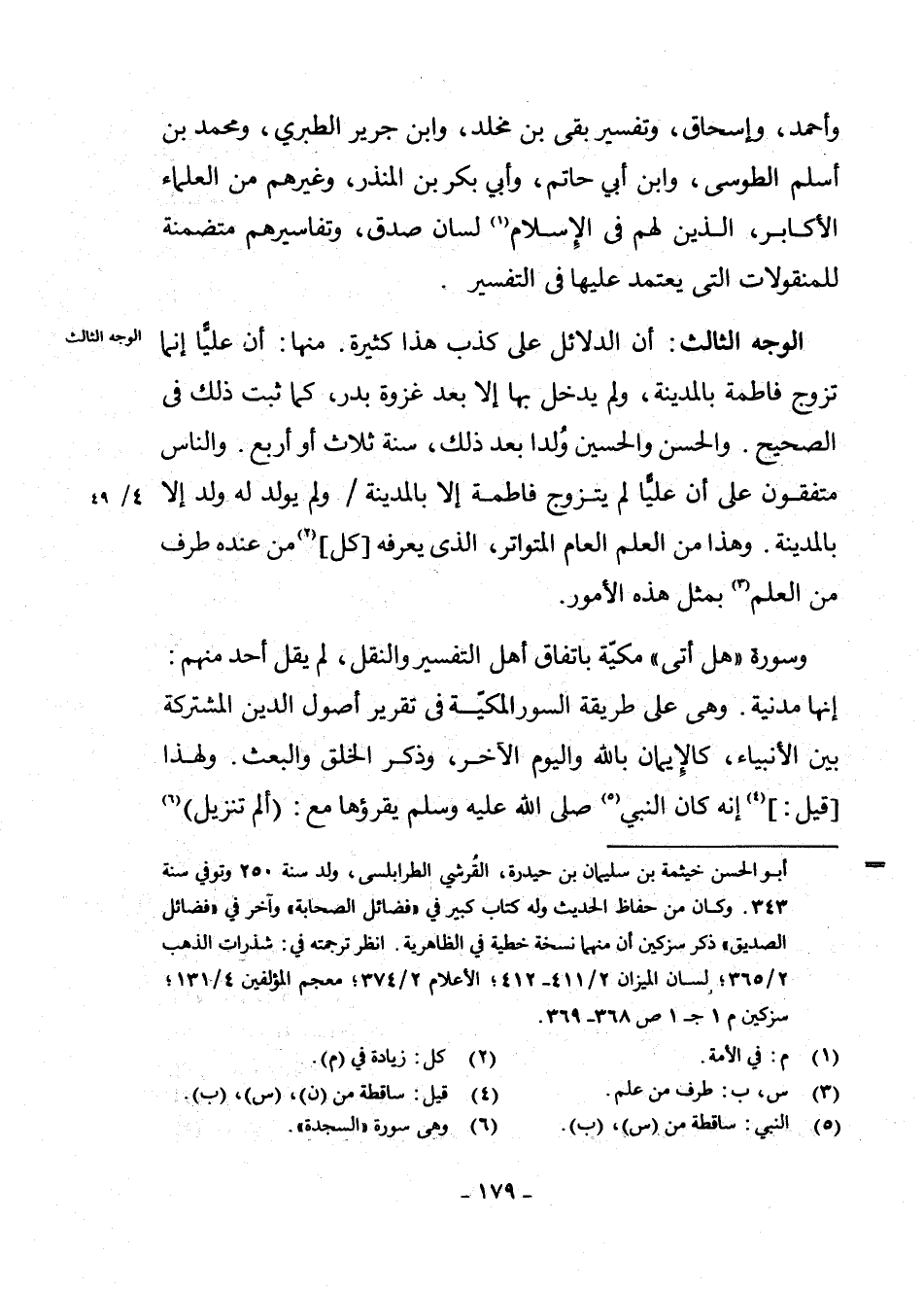 الْوَجْهُ الثَّالِثُ: أَنَّ الدَّلَائِلَ عَلَى كَذِبِ هَذَا كَثِيرَةٌ. مِنْهَا: أَنَّ عَلِيًّا إِنَّمَا تَزَوَّجَ فَاطِمَةَ بِالْمَدِينَةِ، وَلَمْ يَدْخُلْ بِهَا إِلَّا بَعْدَ غَزْوَةِ بَدْرٍ، كَمَا ثَبَتَ ذَلِكَ فِي الصَّحِيحِ. وَالْحَسَنُ وَالْحُسَيْنُ وُلِدَا بَعْدَ ذَلِكَ، سَنَةَ ثَلَاثٍ أَوْ أَرْبَعٍ، وَالنَّاسُ مُتَّفِقُونَ عَلَى أَنَّ عَلِيًّا لَمْ يَتَزَوَّجْ فَاطِمَةَ إِلَّا بِالْمَدِينَةِ وَلَمْ يُولَدْ لَهُ وَلَدٌ إِلَّا بِالْمَدِينَةِ. وَهَذَا مِنَ الْعِلْمِ الْعَامِّ الْمُتَوَاتِرِ، الَّذِي يَعْرِفُهُ [كَلُّ] (¬2) مَنْ عِنْدَهُ طَرَفٌ مِنَ الْعِلْمِ (¬3) بِمِثْلِ هَذِهِ الْأُمُورِ.