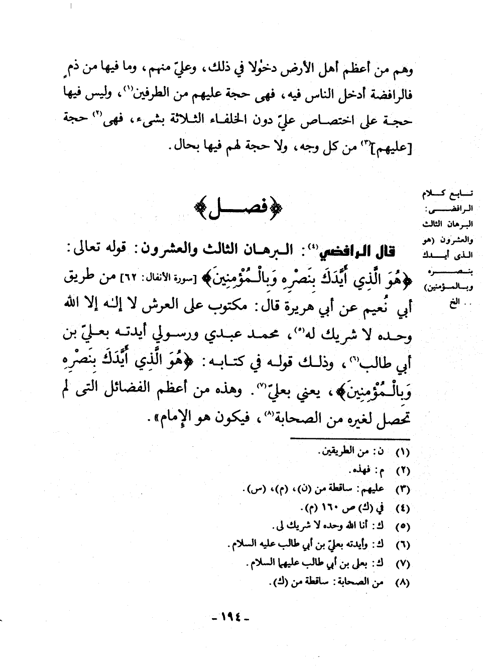 قَالَ الرَّافِضِيُّ (¬4) : الْبُرْهَانُ الثَّالِثُ وَالْعِشْرُونَ: قَوْلُهُ تَعَالَى: {هُوَ الَّذِي أَيَّدَكَ بِنَصْرِهِ وَبِالْمُؤْمِنِينَ} [سُورَةُ الْأَنْفَالِ: 62] مِنْ طَرِيقِ أَبِي نُعَيْمٍ عَنْ أَبِي هُرَيْرَةَ قَالَ: مَكْتُوبٌ عَلَى الْعَرْشِ لَا إِلَهَ إِلَّا اللَّهُ وَحْدَهُ لَا شَرِيكَ لَهُ (¬5) ، مُحَمَّدٌ عَبْدِي وَرَسُولِي أَيَّدْتُهُ بِعَلِيِّ بْنِ أَبِي طَالِبٍ (¬6) ، وَذَلِكَ قَوْلُهُ فِي كِتَابِهِ: ( {هُوَ الَّذِي أَيَّدَكَ بِنَصْرِهِ وَبِالْمُؤْمِنِينَ} ، يَعْنِي بِعَلِيٍّ (¬7) ، وَهَذِهِ مِنْ أَعْظَمِ الْفَضَائِلِ الَّتِي لَمْ تَحْصُلْ لِغَيْرِهِ مِنَ الصَّحَابَةِ (¬8) ، فَيَكُونُ هُوَ الْإِمَامَ ".