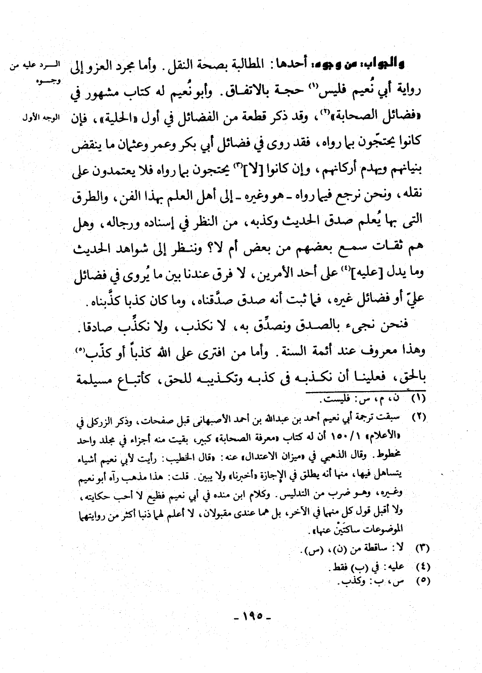 وَالْجَوَابُ مِنْ وُجُوهٍ: أَحَدُهَا: الْمُطَالَبَةُ بِصِحَّةِ النَّقْلِ. وَأَمَّا مُجَرَّدُ الْعَزْوِ إِلَى رِوَايَةِ أَبِي نُعَيْمٍ فَلَيْسَ (¬1) حُجَّةً بِالِاتِّفَاقِ. وَأَبُو نُعَيْمٍ لَهُ كِتَابٌ مَشْهُورٌ فِي " فَضَائِلِ الصَّحَابَةِ " (¬2) ، وَقَدْ ذَكَرَ قِطْعَةً مِنَ الْفَضَائِلِ فِي أَوَّلِ " الْحِلْيَةِ "، فَإِنْ كَانُوا يَحْتَجُّونَ بِمَا رَوَاهُ، فَقَدْ رَوَى فِي فَضَائِلِ أَبِي بَكْرٍ وَعُمَرَ وَعُثْمَانَ مَا يُنْقِضُ بُنْيَانَهُمْ وَيَهْدِمُ أَرْكَانَهُمْ، وَإِنْ كَانُوا [لَا] (¬3) يَحْتَجُّونَ بِمَا رَوَاهُ فَلَا يَعْتَمِدُونَ عَلَى نَقْلِهِ، وَنَحْنُ نَرْجِعُ فِيمَا رَوَاهُ - هُوَ وَغَيْرُهُ - إِلَى أَهْلِ الْعِلْمِ بِهَذَا الْفَنِّ وَالطُّرُقِ الَّتِي بِهَا يُعْلَمُ صِدْقُ الْحَدِيثِ وَكَذِبُهُ، مِنَ النَّظَرِ فِي إِسْنَادِهِ وَرِجَالِهِ، وَهَلْ هُمْ ثِقَاتٌ سَمِعَ بَعْضُهُمْ مِنْ بَعْضٍ أَمْ لَا؟ وَنَنْظُرُ إِلَى شَوَاهِدِ الْحَدِيثِ وَمَا يَدُلُّ [عَلَيْهِ] (¬4) عَلَى أَحَدِ الْأَمْرَيْنِ، لَا فَرْقَ عِنْدَنَا بَيْنَ مَا يُرْوَى فِي فَضَائِلِ عَلِيٍّ أَوْ فَضَائِلِ غَيْرِهِ، فَمَا ثَبَتَ أَنَّهُ صِدْقٌ صَدَّقْنَاهُ، وَمَا كَانَ كَذِبًا كَذَّبْنَاهُ.