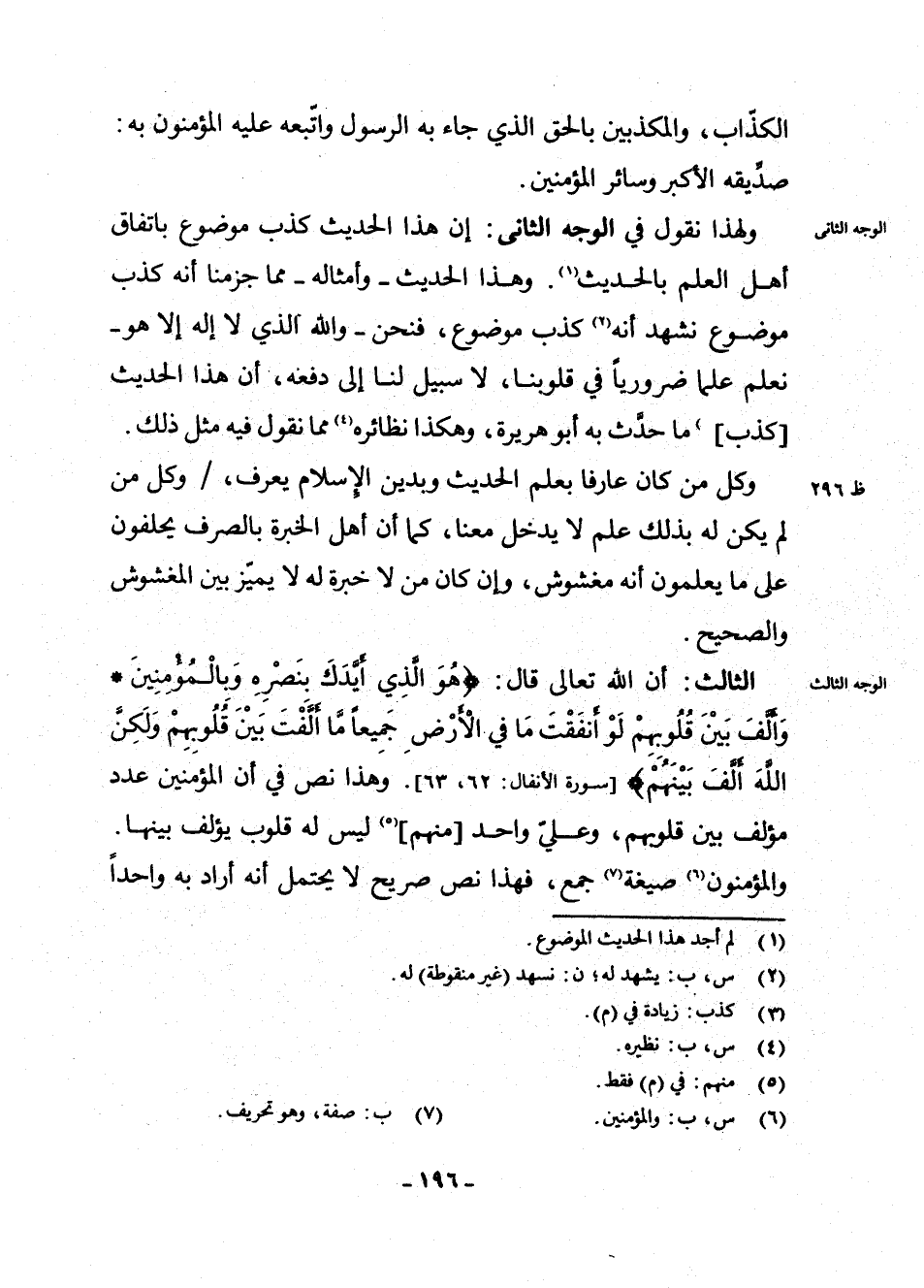 الثَّالِثُ: أَنَّ اللَّهَ تَعَالَى قَالَ: {هُوَ الَّذِي أَيَّدَكَ بِنَصْرِهِ وَبِالْمُؤْمِنِينَ وَأَلَّفَ بَيْنَ قُلُوبِهِمْ لَوْ أَنْفَقْتَ مَا فِي الْأَرْضِ جَمِيعًا مَا أَلَّفْتَ بَيْنَ قُلُوبِهِمْ وَلَكِنَّ اللَّهَ أَلَّفَ بَيْنَهُمْ} [سُورَةُ الْأَنْفَالِ: 62 - 63] . وَهَذَا نَصٌّ فِي أَنَّ الْمُؤْمِنِينَ عَدَدٌ مُؤَلَّفٌ بَيْنَ قُلُوبِهِمْ، وَعَلِيٌّ وَاحِدٌ [مِنْهُمْ] (¬5) لَيْسَ لَهُ قُلُوبٌ يُؤَلَّفُ بَيْنَهَا.