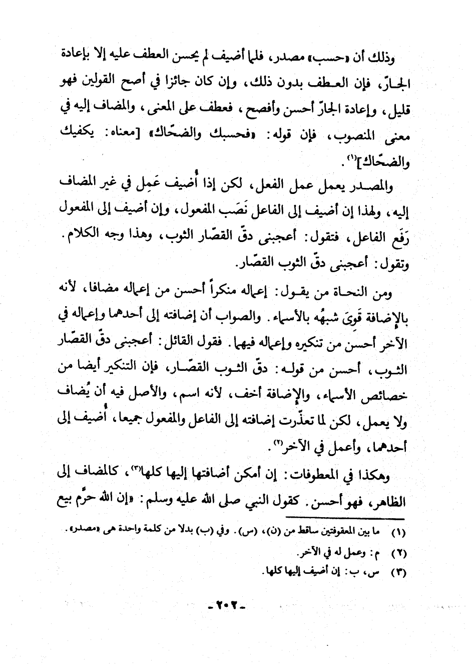 وَهَكَذَا فِي الْمَعْطُوفَاتِ: إِنْ أَمْكَنَ إِضَافَتُهَا إِلَيْهَا كُلَّهَا (¬3) ، كَالْمُضَافِ إِلَى الظَّاهِرِ، فَهُوَ أَحْسَنُ. كَقَوْلِ النَّبِيِّ - صَلَّى اللَّهُ عَلَيْهِ وَسَلَّمَ -: " «إِنَّ اللَّهَ حَرَّمَ بَيْعَ