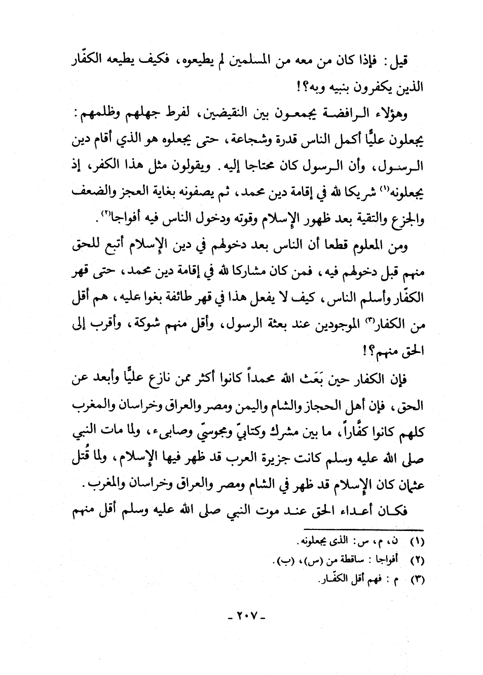 فَإِنَّ الْكُفَّارَ حِينَ بَعَثَ اللَّهُ مُحَمَّدًا كَانُوا أَكْثَرَ مِمَّنْ نَازَعَ عَلِيًّا وَأَبْعَدَ عَنِ الْحَقِّ، فَإِنَّ أَهْلَ الْحِجَازِ وَالشَّامِ وَالْيَمَنِ وَمِصْرَ وَالْعِرَاقِ وَخُرَاسَانَ وَالْمَغْرِبِ كُلَّهُمْ كَانُوا كُفَّارًا، مَا بَيْنَ مُشْرِكٍ وَكِتَابِيٍّ وَمَجُوسِيٍّ وَصَابِئٍ، وَلَمَّا مَاتَ النَّبِيُّ - صَلَّى اللَّهُ عَلَيْهِ وَسَلَّمَ - كَانَتْ جَزِيرَةُ الْعَرَبِ قَدْ ظَهَرَ فِيهَا الْإِسْلَامُ، وَلَمَّا قُتِلَ عُثْمَانُ كَانَ الْإِسْلَامُ قَدْ ظَهَرَ فِي الشَّامِ وَمِصْرَ وَالْعِرَاقِ وَخُرَاسَانَ وَالْمَغْرِبِ.