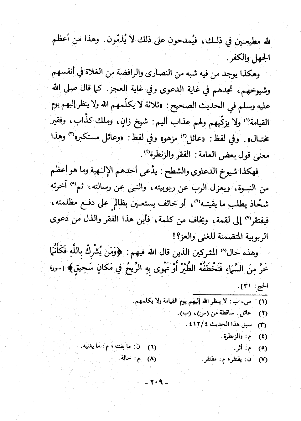 وَهَكَذَا يُوجَدُ مَنْ فِيهِ شَبَهٌ مِنَ النَّصَارَى وَالرَّافِضَةِ مِنَ الْغُلَاةِ فِي أَنْفُسِهِمْ وَشُيُوخِهِمْ، تَجِدُهُمْ فِي غَايَةِ الدَّعْوَى وَفِي غَايَةِ الْعَجْزِ. كَمَا قَالَ - صَلَّى اللَّهُ عَلَيْهِ وَسَلَّمَ - فِي الْحَدِيثِ الصَّحِيحِ: " «ثَلَاثَةٌ لَا يُكَلِّمُهُمُ اللَّهُ وَلَا يَنْظُرُ إِلَيْهِمْ يَوْمَ الْقِيَامَةِ (¬1) وَلَا يُزَكِّيهِمْ وَلَهُمْ عَذَابٌ أَلِيمٌ: شَيْخٌ زَانٍ، وَمَلِكٌ كَذَّابٌ، وَفَقِيرٌ مُخْتَالٌ ". وَفِي لَفْظٍ: " عَائِلٌ (¬2) مَزْهُوٌّ " وَفِي لَفْظٍ: " وَعَائِلٌ مُسْتَكْبِرٌ» " (¬3) وَهَذَا مَعْنَى قَوْلِ بَعْضِ الْعَامَّةِ: الْفَقْرُ وَالزَّنْطَرَةُ (¬4) .