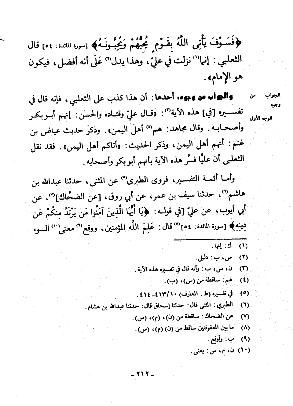 وَأَمَّا أَئِمَّةُ التَّفْسِيرِ، فَرَوَى الطَّبَرِيُّ (¬5) عَنِ الْمُثَنَّى، حَدَّثَنَا عَبْدُ اللَّهِ بْنُ هَاشِمٍ (¬6) ، حَدَّثَنَا سَيْفُ بْنُ عُمَرَ، عَنْ أَبِي رَوْقٍ، [عَنِ الضَّحَّاكِ] (¬7) ، عَنْ أَبِي أَيُّوبَ، عَنْ عَلِيٍّ [فِي قَوْلِهِ: {يَاأَيُّهَا الَّذِينَ آمَنُوا مَنْ يَرْتَدَّ مِنْكُمْ عَنْ دِينِهِ} [سُورَةُ الْمَائِدَةِ: 54] (¬8) قَالَ: عَلِمَ اللَّهُ الْمُؤْمِنِينَ، وَوَقَعَ (¬9) مَعْنَى (¬10) السُّوءِ