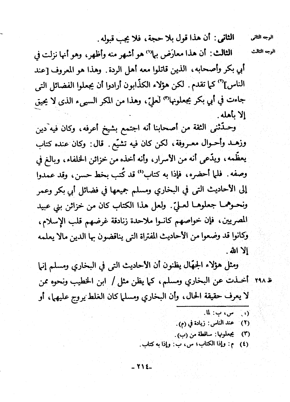 وَحَدَّثَنِي الثِّقَةُ مِنْ أَصْحَابِنَا أَنَّهُ اجْتَمَعَ بِشَيْخٍ أَعْرِفُهُ، وَكَانَ فِيهِ دِينٌ وَزُهْدٌ وَأَحْوَالٌ مَعْرُوفَةٌ لَكِنْ كَانَ فِيهِ تَشَيُّعٌ. قَالَ: وَكَانَ عِنْدَهُ كِتَابٌ يُعَظِّمُهُ، وَيَدَّعِي أَنَّهُ مِنَ الْأَسْرَارِ، وَأَنَّهُ أَخَذَهُ مِنْ خَزَائِنِ الْخُلَفَاءِ، وَبَالَغَ فِي وَصْفِهِ. فَلَمَّا أَحْضَرَهُ، فَإِذَا بِهِ كِتَابٌ (¬4) قَدْ كُتِبَ بِخَطٍّ حَسَنٍ، وَقَدْ عَمَدُوا إِلَى الْأَحَادِيثِ الَّتِي فِي الْبُخَارِيِّ وَمُسْلِمٍ جَمِيعِهَا فِي فَضَائِلِ أَبِي بَكْرٍ وَعُمَرَ وَنَحْوِهِمَا جَعَلُوهَا لِعَلِيٍّ. وَلَعَلَّ هَذَا الْكِتَابَ كَانَ مِنْ خَزَائِنِ بَنِي عُبَيْدٍ الْمِصْرِيِّينَ، فَإِنَّ خَوَاصَّهُمْ كَانُوا مَلَاحِدَةً زَنَادِقَةً غَرَضُهُمْ قَلْبُ الْإِسْلَامِ، وَكَانُوا قَدْ وَضَعُوا مِنَ الْأَحَادِيثِ الْمُفْتَرَاةِ الَّتِي يُنَاقِضُونَ بِهَا الدِّينَ مَا لَا يَعْلَمُهُ إِلَّا اللَّهُ.