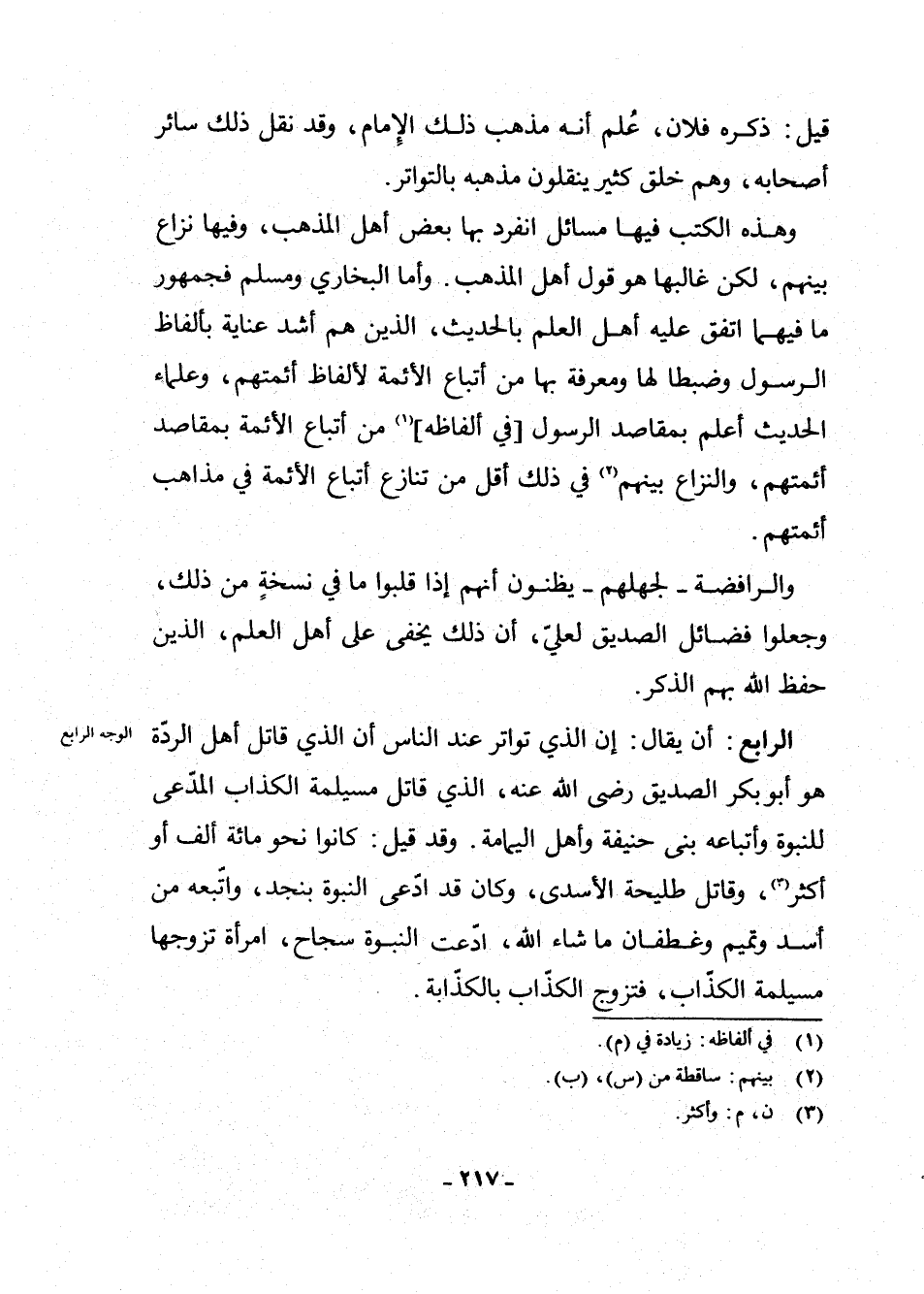 الرَّابِعُ: أَنْ يُقَالَ: إِنَّ الَّذِي تَوَاتَرَ عِنْدَ النَّاسِ أَنَّ الَّذِي قَاتَلَ أَهْلَ الرِّدَّةِ هُوَ أَبُو بَكْرٍ الصِّدِّيقُ - رَضِيَ اللَّهُ عَنْهُ - الَّذِي قَاتَلَ مُسَيْلِمَةَ الْكَذَّابَ الْمُدَّعِيَ لِلنُّبُوَّةِ وَأَتْبَاعَهُ بَنِي حَنِيفَةَ وَأَهْلَ الْيَمَامَةِ. قَدْ قِيلَ: كَانُوا نَحْوَ مِائَةِ أَلْفٍ أَوْ أَكْثَرَ (¬3) ، وَقَاتَلَ طُلَيْحَةَ الْأَسَدِيَّ، وَكَانَ قَدِ ادَّعَى النُّبُوَّةَ بِنَجْدٍ، وَاتَّبَعَهُ مِنْ أَسَدٍ وَتَمِيمٍ وَغَطَفَانَ مَا شَاءَ اللَّهُ، ادَّعَتِ النُّبُوَّةَ سَجَاحٌ، امْرَأَةٌ تَزَوَّجَهَا مُسَيْلِمَةُ الْكَذَّابُ، فَتَزَوَّجَ الْكَذَّابُ بِالْكَذَّابَةِ.