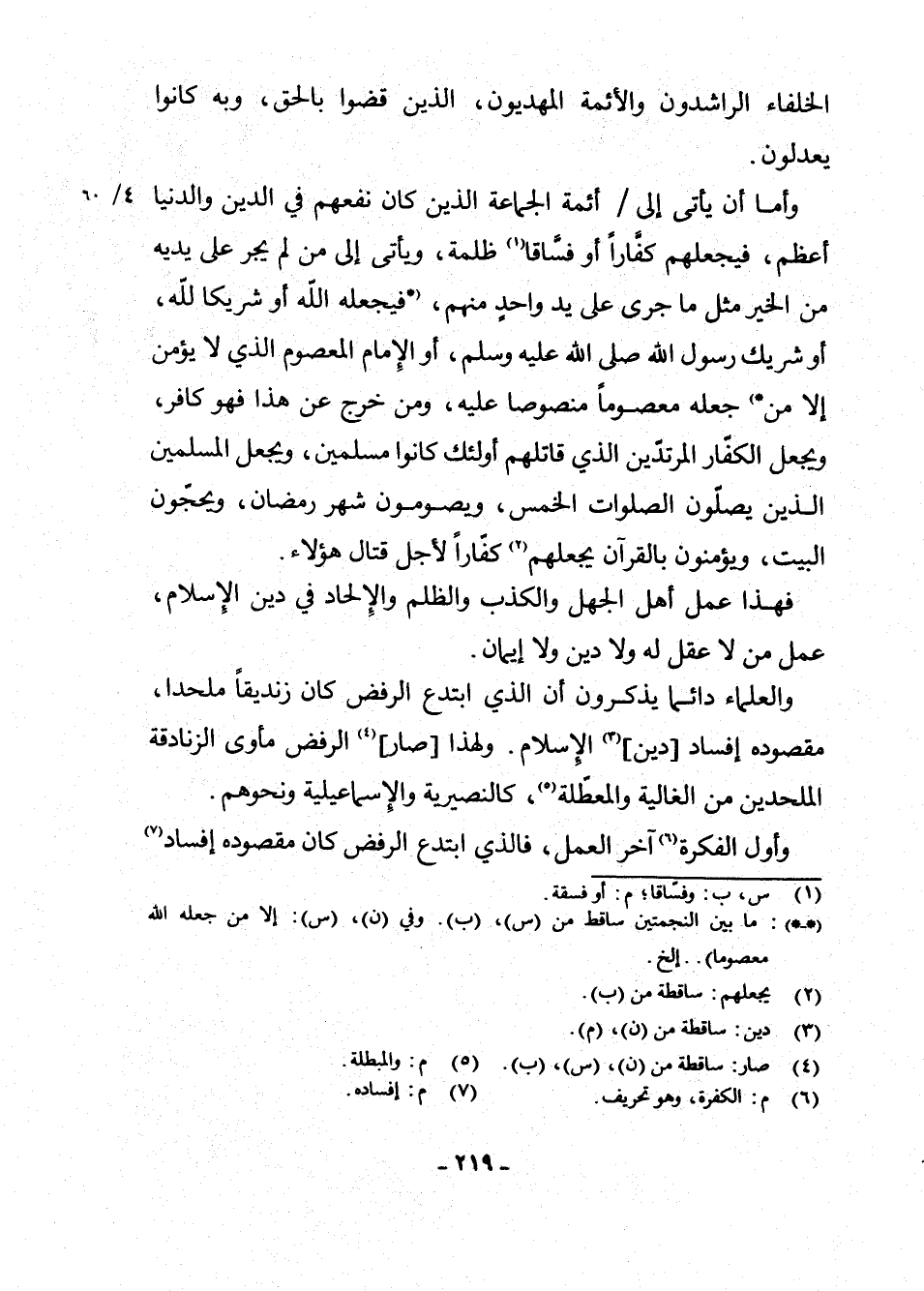 وَأَمَّا أَنْ يَأْتِيَ إِلَى أَئِمَّةِ الْجَمَاعَةِ الَّذِينَ كَانَ نَفْعُهُمْ فِي الدِّينِ وَالدُّنْيَا أَعْظَمَ، فَيَجْعَلَهُمْ كُفَّارًا أَوْ فُسَّاقًا (¬1) ظَلَمَةً، وَيَأْتِيَ إِلَى مَنْ لَمْ يَجْرِ عَلَى يَدَيْهِ مِنَ الْخَيْرِ مِثْلُ مَا جَرَى عَلَى يَدِ وَاحِدٍ مِنْهُمْ، * فَيَجْعَلَهُ اللَّهَ أَوْ شَرِيكًا لِلَّهِ، أَوْ شَرِيكَ رَسُولِ اللَّهِ - صَلَّى اللَّهُ عَلَيْهِ وَسَلَّمَ -، أَوِ الْإِمَامَ الْمَعْصُومَ الَّذِي لَا يُؤْمِنُ إِلَّا مَنْ * (¬2) جَعَلَهُ مَعْصُومًا مَنْصُوصًا عَلَيْهِ، وَمَنْ خَرَجَ عَنْ هَذَا فَهُوَ كَافِرٌ، وَيَجْعَلَ الْكُفَّارَ الْمُرْتَدِّينَ الَّذِي قَاتَلَهُمْ أُولَئِكَ كَانُوا مُسْلِمِينَ، وَيَجْعَلَ الْمُسْلِمِينَ الَّذِينَ يُصَلُّونَ الصَّلَوَاتِ الْخَمْسَ، وَيَصُومُونَ شَهْرَ رَمَضَانَ، وَيَحُجُّونَ الْبَيْتَ، وَيُؤْمِنُونَ بِالْقُرْآنِ يَجْعَلُهُمْ (¬3) كُفَّارًا لِأَجْلِ قِتَالِ هَؤُلَاءِ.