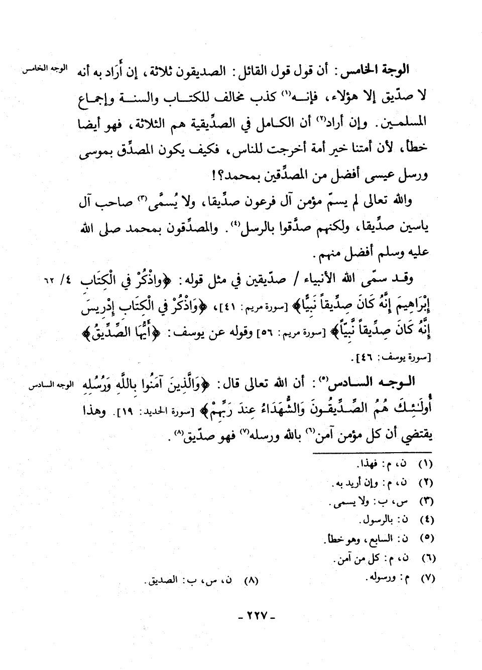 الْوَجْهُ الْخَامِسُ: أَنَّ قَوْلَ الْقَائِلِ: الصِّدِّيقُونَ ثَلَاثَةٌ، إِنْ أَرَادَ بِهِ أَنَّهُ لَا صِدِّيقَ إِلَّا هَؤُلَاءِ، فَإِنَّهُ (¬1) كَذِبٌ مُخَالِفٌ لِلْكِتَابِ وَالسُّنَّةِ وَإِجْمَاعِ الْمُسْلِمِينَ. وَإِنْ أَرَادَ (¬2) أَنَّ الْكَامِلَ فِي الصِّدِّيقِيَّةِ هُمُ الثَّلَاثَةُ، فَهُوَ أَيْضًا خَطَأٌ ; لِأَنَّ أُمَّتَنَا خَيْرُ أُمَّةٍ أُخْرِجَتْ لِلنَّاسِ ; فَكَيْفَ يَكُونُ الْمُصَدِّقُ بِمُوسَى وَرُسُلِ عِيسَى أَفْضَلَ مِنَ الْمُصَدِّقِينَ بِمُحَمَّدٍ؟ !