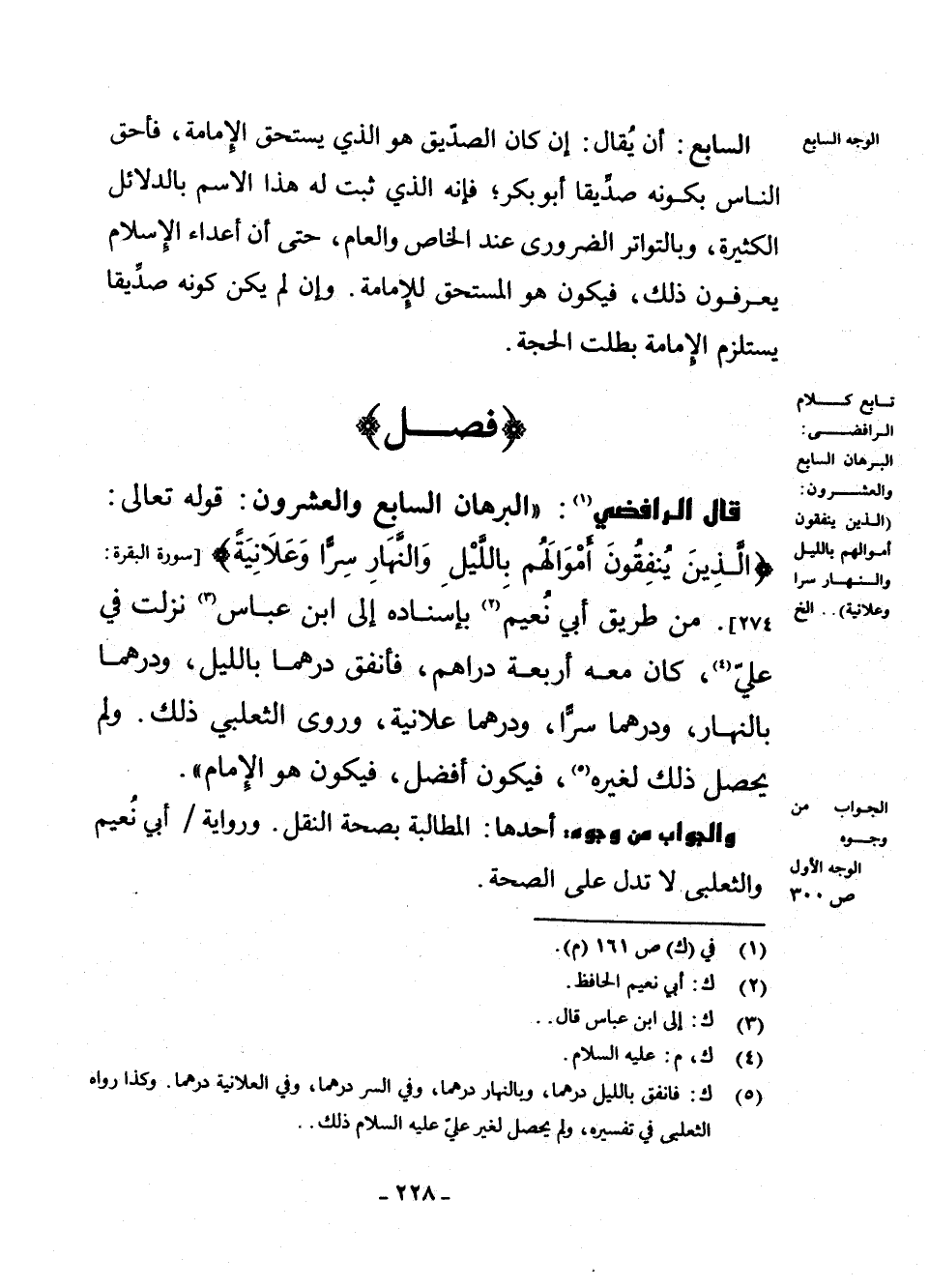 قَالَ الرَّافِضِيُّ (¬1) : " الْبُرْهَانُ السَّابِعُ وَالْعِشْرُونَ: قَوْلُهُ تَعَالَى: {الَّذِينَ يُنْفِقُونَ أَمْوَالَهُمْ بِاللَّيْلِ وَالنَّهَارِ سِرًّا وَعَلَانِيَةً} [سُورَةُ الْبَقَرَةِ: 274] . مِنْ طَرِيقِ أَبِي نُعَيْمٍ (¬2) بِإِسْنَادِهِ إِلَى ابْنِ عَبَّاسٍ (¬3) نَزَلَتْ فِي عَلِيٍّ (¬4) ، كَانَ مَعَهُ أَرْبَعَةُ دَرَاهِمَ، فَأَنْفَقَ دِرْهَمًا بِاللَّيْلِ، وَدِرْهَمًا بِالنَّهَارِ، وَدِرْهَمًا سِرًّا، وَدِرْهَمًا عَلَانِيَةً، وَرَوَى الثَّعْلَبِيُّ ذَلِكَ. وَلَمْ يَحْصُلْ ذَلِكَ لِغَيْرِهِ (¬5) ، فَيَكُونُ أَفْضَلَ، فَيَكُونُ هُوَ الْإِمَامَ ".