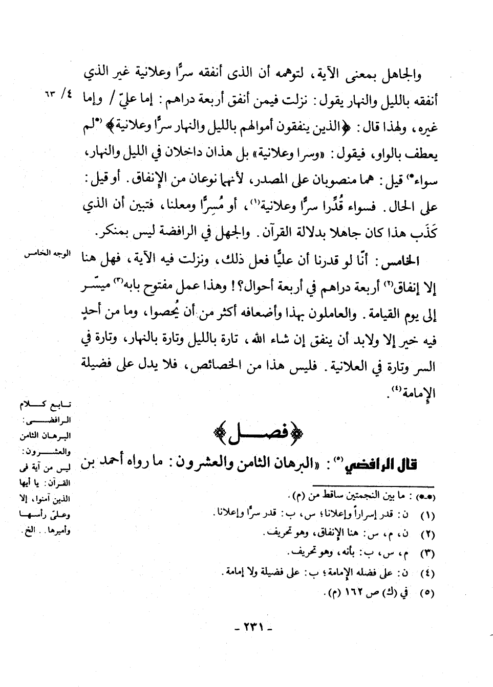 وَالْجَاهِلُ بِمَعْنَى الْآيَةِ، لِتَوَهُّمِهِ أَنَّ الَّذِي أَنْفَقَهُ سِرًّا وَعَلَانِيَةً غَيْرُ الَّذِي أَنْفَقَهُ فِي اللَّيْلِ وَالنَّهَارِ - يَقُولُ: نَزَلَتْ فِيمَنْ أَنْفَقَ أَرْبَعَةَ دَرَاهِمَ، إِمَّا عَلِيٍّ وَإِمَّا غَيْرِهِ، وَلِهَذَا قَالَ: {الَّذِينَ يُنْفِقُونَ أَمْوَالَهُمْ بِاللَّيْلِ وَالنَّهَارِ سِرًّا وَعَلَانِيَةً} * لَمْ يَعْطِفْ بِالْوَاوِ، فَيَقُولُ: وَسِرًّا وَعَلَانِيَةً. بَلْ هَذَانِ دَاخِلَانِ فِي اللَّيْلِ وَالنَّهَارِ، سَوَاءٌ * (¬1) قِيلَ: هُمَا مَنْصُوبَانِ عَلَى الْمَصْدَرِ ; لِأَنَّهُمَا نَوْعَانِ مِنَ الْإِنْفَاقِ، أَوْ قِيلَ: عَلَى الْحَالِ. فَسَوَاءٌ قُدِّرَا سِرًّا وَعَلَانِيَةً (¬2) ، أَوْ مُسِرًّا وَمُعْلِنًا، فَتَبَيَّنَ أَنَّ الَّذِي كَذَّبَ هَذَا كَانَ جَاهِلًا بِدَلَالَةِ الْقُرْآنِ. وَالْجَهْلُ فِي الرَّافِضَةِ لَيْسَ بِمُنْكَرٍ.
