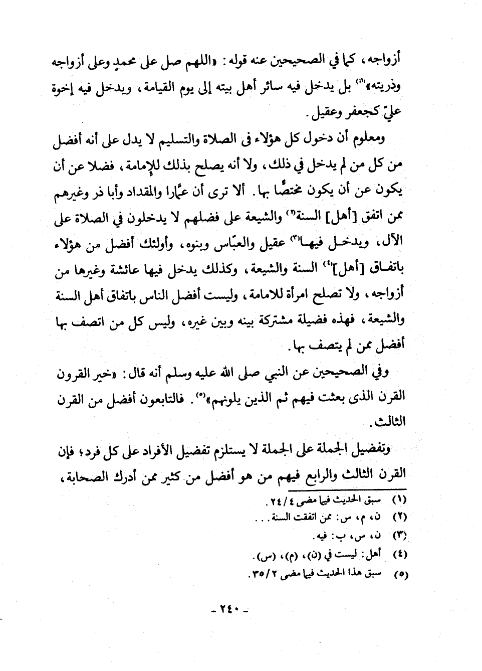 وَمَعْلُومٌ أَنَّ دُخُولَ هَؤُلَاءِ فِي الصَّلَاةِ وَالتَّسْلِيمِ لَا يَدُلُّ عَلَى أَنَّهُ أَفْضَلُ مِنْ كُلِّ مَنْ لَمْ يَدْخَلْ فِي ذَلِكَ، وَلَا أَنَّهُ يَصْلُحُ بِذَلِكَ لِلْإِمَامَةِ، فَضْلًا عَنْ أَنْ يَكُونَ مُخْتَصًّا بِهَا، أَلَا تَرَى أَنَّ عَمَّارًا وَالْمِقْدَادَ وَأَبَا ذَرٍّ وَغَيْرَهُمْ مِمَّنِ اتَّفَقَ [أَهْلُ] السُّنَّةِ (¬2) وَالشِّيعَةُ عَلَى فَضْلِهِمْ لَا يَدْخُلُونَ فِي الصَّلَاةِ عَلَى الْآلِ، وَيَدْخُلُ فِيهَا (¬3) عَقِيلٌ وَالْعَبَّاسُ وَبَنُوهُ، وَأُولَئِكَ أَفْضَلُ مِنْ هَؤُلَاءِ بِاتِّفَاقِ [أَهْلِ] (¬4) السُّنَّةِ وَالشِّيعَةِ، وَكَذَلِكَ يَدْخُلُ فِيهَا عَائِشَةُ وَغَيْرُهَا مِنْ أَزْوَاجِهِ، وَلَا تَصْلُحُ امْرَأَةٌ لِلْإِمَامَةِ، وَلَيْسَتْ أَفْضَلَ النَّاسِ بِاتِّفَاقِ أَهْلِ السُّنَّةِ وَالشِّيعَةِ، فَهَذِهِ فَضِيلَةٌ مُشْتَرَكَةٌ بَيْنَهُ وَبَيْنَ غَيْرِهِ، وَلَيْسَ كُلُّ مَنِ اتَّصَفَ بِهَا أَفْضَلَ مِمَّنْ لَمْ يَتَّصِفْ بِهَا.