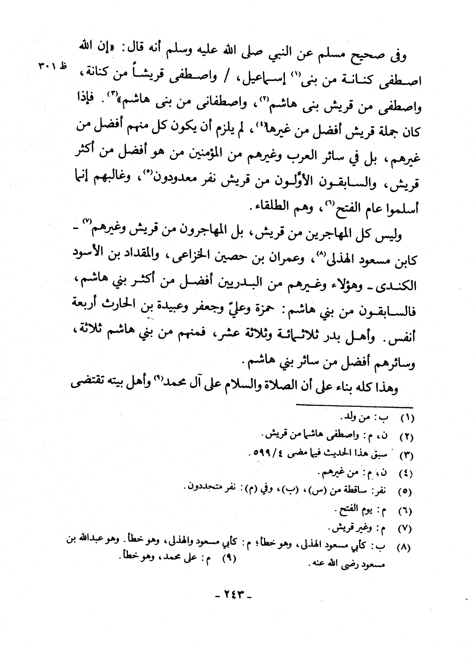 وَفِي صَحِيحِ مُسْلِمٍ عَنِ النَّبِيِّ - صَلَّى اللَّهُ عَلَيْهِ وَسَلَّمَ - أَنَّهُ قَالَ: " «إِنَّ اللَّهَ اصْطَفَى كِنَانَةَ مِنْ بَنِي (¬1) إِسْمَاعِيلَ، وَاصْطَفَى قُرَيْشًا مِنْ كِنَانَةَ، وَاصْطَفَى مِنْ قُرَيْشٍ بَنِي هَاشِمٍ (¬2) ، وَاصْطَفَانِي مِنْ بَنِي هَاشِمٍ» " (¬3) . فَإِذَا كَانَ جُمْلَةُ قُرَيْشٍ أَفْضَلَ مِنْ غَيْرِهَا (¬4) لَمْ يَلْزَمْ أَنْ يَكُونَ كُلٌّ مِنْهُمْ أَفْضَلَ مِنْ غَيْرِهِمْ، بَلْ فِي سَائِرِ الْعَرَبِ وَغَيْرِهِمْ مِنَ الْمُؤْمِنِينَ مَنْ هُوَ أَفْضَلُ مِنْ أَكْثَرِ قُرَيْشٍ، وَالسَّابِقُونَ الْأَوَّلُونَ مِنْ قُرَيْشٍ نَفَرٌ مَعْدُودُونَ (¬5) ، وَغَالِبُهُمْ إِنَّمَا أَسْلَمُوا عَامَ الْفَتْحِ (¬6) ، وَهُمُ الطُّلَقَاءُ.