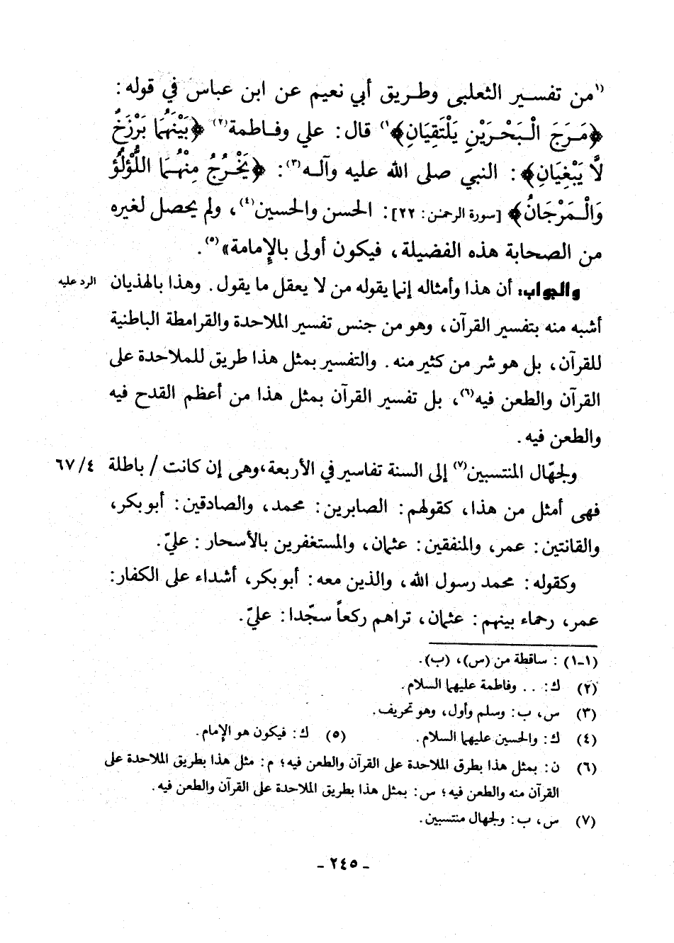(¬1) مِنْ تَفْسِيرِ الثَّعْلَبِيِّ وَطَرِيقِ أَبِي نُعَيْمٍ عَنِ ابْنِ عَبَّاسٍ فِي قَوْلِهِ: {مَرَجَ الْبَحْرَيْنِ يَلْتَقِيَانِ} (¬2) قَالَ: عَلِيٌّ وَفَاطِمَةُ (¬3) {بَيْنَهُمَا بَرْزَخٌ لَا يَبْغِيَانِ} : النَّبِيُّ - صَلَّى اللَّهُ عَلَيْهِ وَسَلَّمَ - وَآلُهُ (¬4) : {يَخْرُجُ مِنْهُمَا اللُّؤْلُؤُ وَالْمَرْجَانُ} [سُورَةُ الرَّحْمَنِ: 22] : الْحَسَنُ وَالْحُسَيْنُ (¬5) ، وَلَمْ يَحْصُلْ لِغَيْرِهِ مِنَ الصَّحَابَةِ هَذِهِ الْفَضِيلَةُ، فَيَكُونُ أَوْلَى بِالْإِمَامَةِ " (¬6) .