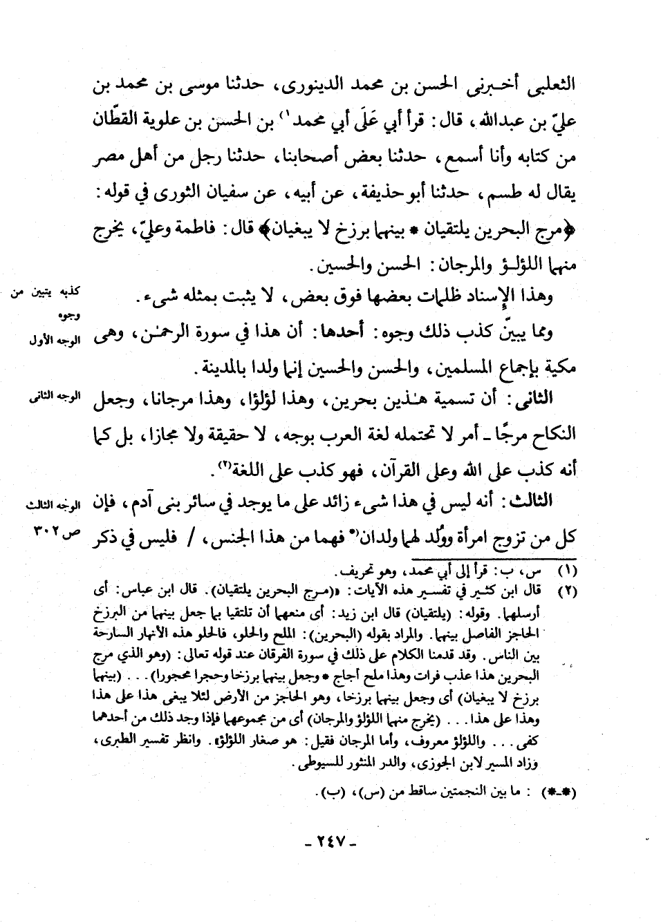 : " الثَّعْلَبِيُّ أَخْبَرَنِي الْحَسَنُ بْنُ مُحَمَّدٍ الدَّيْنَوَرِيُّ، حَدَّثَنَا مُوسَى بْنُ مُحَمَّدِ بْنِ عَلِيِّ بْنِ عَبْدِ اللَّهِ، قَالَ: قَرَأَ أَبِي عَلَى أَبِي مُحَمَّدِ (¬1) بْنِ الْحَسَنِ بْنِ عُلْوِيَّةَ الْقَطَّانِ مِنْ كِتَابِهِ وَأَنَا أَسْمَعُ، حَدَّثَنَا بَعْضُ أَصْحَابِنَا، حَدَّثَنَا رَجُلٌ مِنْ أَهْلِ مِصْرَ يُقَالُ لَهُ طَسْمٌ، حَدَّثَنَا أَبُو حُذَيْفَةَ، عَنْ أَبِيهِ، عَنْ سُفْيَانَ الثَّوْرِيِّ فِي قَوْلِهِ: {مَرَجَ الْبَحْرَيْنِ يَلْتَقِيَانِ - بَيْنَهُمَا بَرْزَخٌ لَا يَبْغِيَانِ} قَالَ: فَاطِمَةُ وَعَلِيٌّ، {يَخْرُجُ مِنْهُمَا اللُّؤْلُؤُ وَالْمَرْجَانُ} : الْحَسَنُ وَالْحُسَيْنُ.