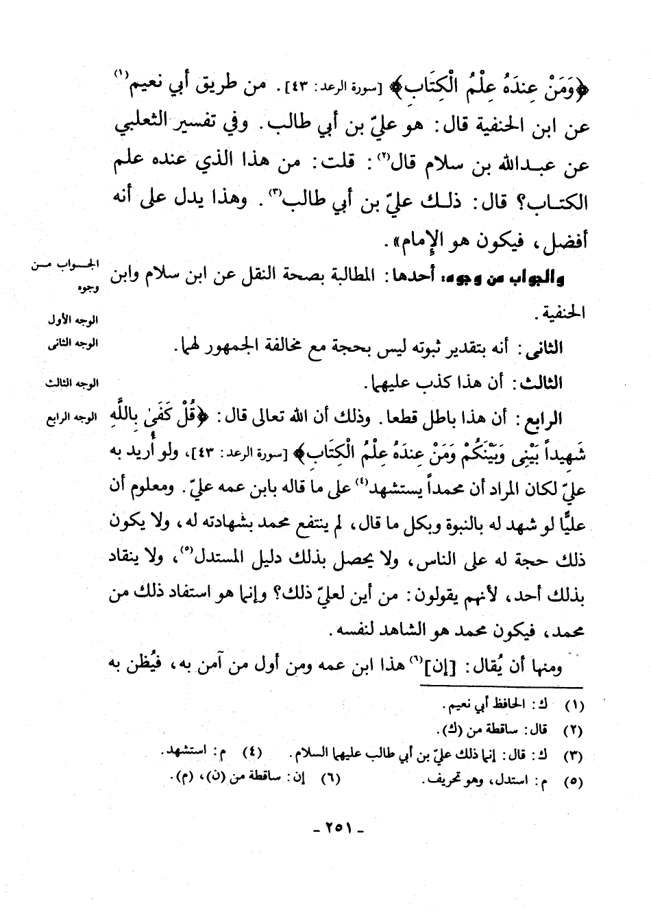 {وَمَنْ عِنْدَهُ عِلْمُ الْكِتَابِ} [سُورَةُ الرَّعْدِ: 43] . مِنْ طَرِيقِ أَبِي نُعَيْمٍ (¬1) عَنِ ابْنِ الْحَنَفِيَّةِ قَالَ: هُوَ عَلِيُّ بْنُ أَبِي طَالِبٍ. وَفِي تَفْسِيرِ الثَّعْلَبِيِّ عَنْ عَبْدِ اللَّهِ بْنِ سَلَامٍ قَالَ (¬2) : قُلْتُ: مَنْ هَذَا الَّذِي عِنْدَهُ عِلْمُ الْكِتَابِ؟ قَالَ: ذَلِكَ عَلِيُّ بْنُ أَبِي طَالِبٍ (¬3) . وَهَذَا يَدُلُّ عَلَى أَنَّهُ أَفْضَلُ، فَيَكُونُ هُوَ الْإِمَامَ ".