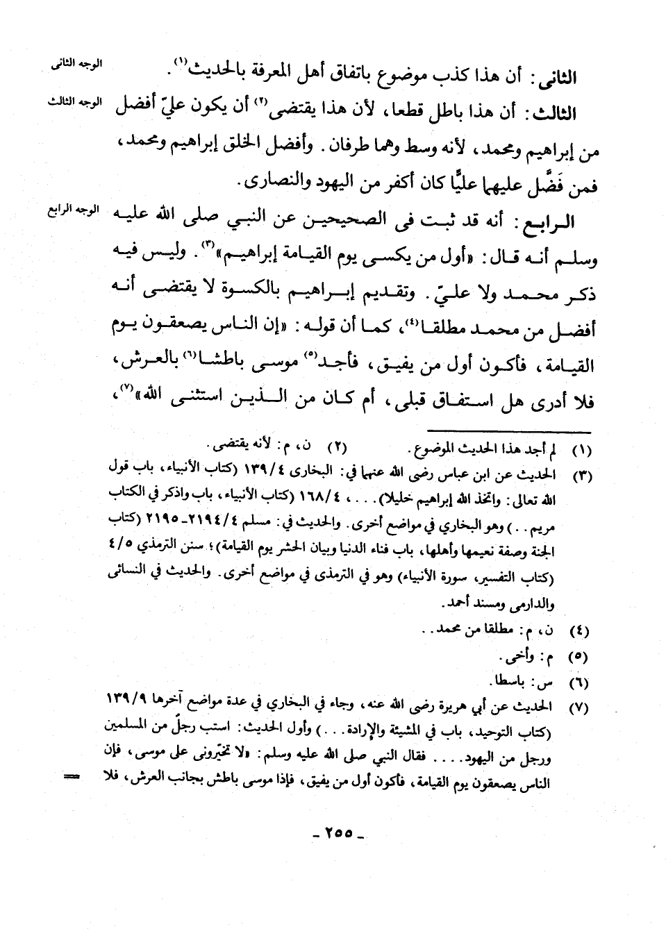 (¬7) الْحَدِيثُ عَنْ أَبِي هُرَيْرَةَ رَضِيَ اللَّهُ عَنْهُ، وَجَاءَ فِي الْبُخَارِيِّ فِي عِدَّةِ مَوَاضِعَ آخِرُهَا 9/139 (كِتَابُ التَّوْحِيدِ بَابٌ فِي الْمَشِيئَةِ وَالْإِرَادَةِ) ، وَأَوَّلُ الْحَدِيثِ اسْتَبَّ رَجُلٌ مِنَ الْمُسْلِمِينَ وَرَجُلٌ مِنَ الْيَهُودِ. . .، فَقَالَ النَّبِيُّ صَلَّى اللَّهُ عَلَيْهِ وَسَلَّمَ: " لَا تُخَيِّرُونِي عَلَى مُوسَى، فَإِنَّ النَّاسَ يُصْعَقُونَ يَوْمَ الْقِيَامَةِ، فَأَكُونُ أَوَّلَ مَنْ يَفِيقُ، فَإِذَا مُوسَى بَاطِشٌ بِجَانِبِ الْعَرْشِ، فَلَا أَدْرِي أَكَانَ فِيمَنْ صُعِقَ فَأَفَاقَ قَبْلِي، أَوْ كَانَ مِمَّنِ اسْتَثْنَى اللَّهُ "، وَالْحَدِيثُ مَعَ اخْتِلَافِ الْأَلْفَاظِ فِي مُسْلِمٍ 4/1844 - 1845 (كِتَابُ الْفَضَائِلِ، بَابٌ مِنْ فَضَائِلِ مُوسَى صَلَّى اللَّهُ عَلَيْهِ وَسَلَّمَ) ، سُنَنِ أَبِي دَاوُدَ، 4/301 - 302 (كِتَابُ السُّنَّةِ، بَابٌ فِي التَّخْيِيرِ بَيْنَ الْأَنْبِيَاءِ عَلَيْهِمُ الصَّلَاةُ وَالسَّلَامُ) ، وَالْمُسْنَدِ (ط. الْمَعَارِفِ) 14/20 - 22 رَقْمِ 7576.