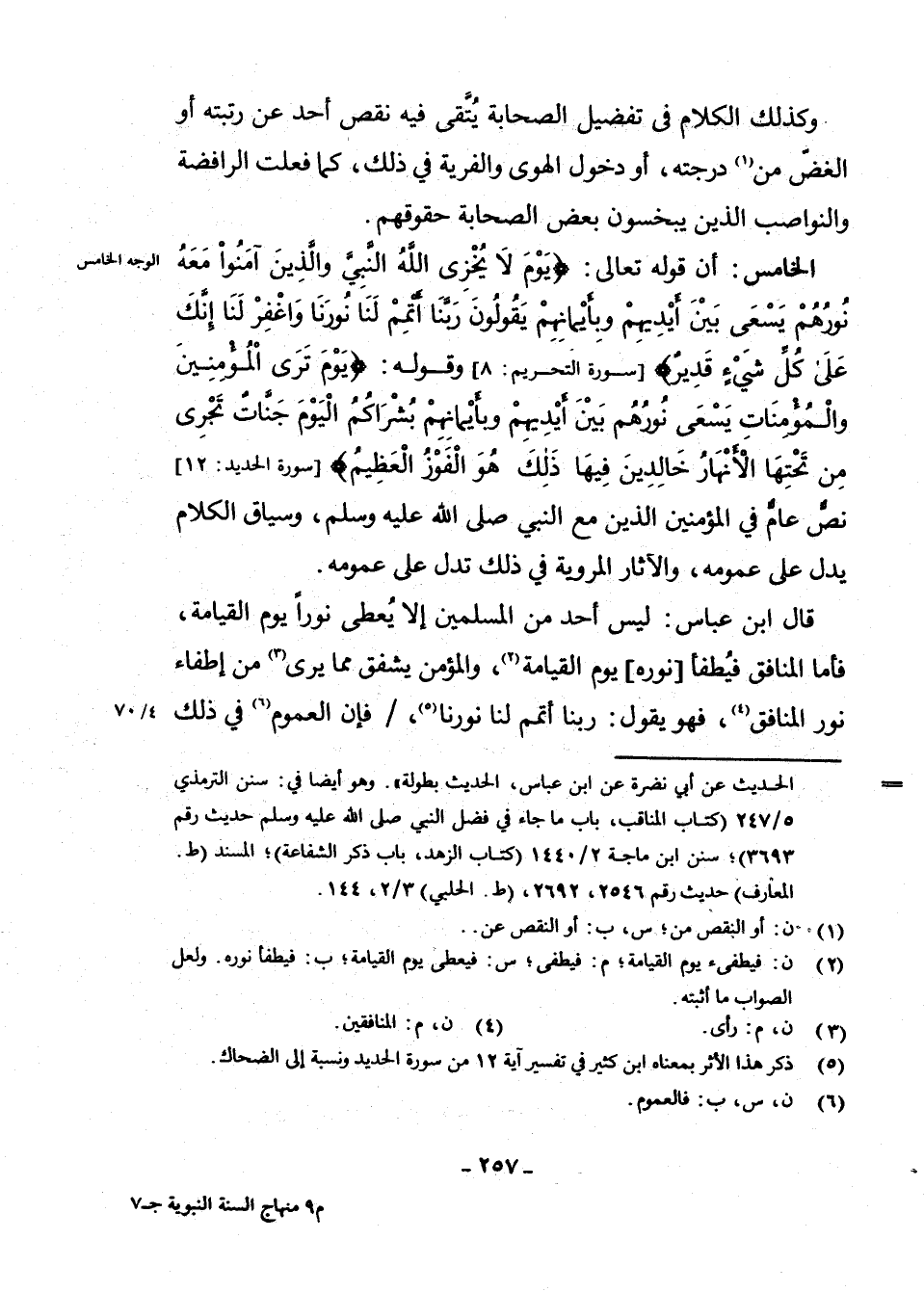 الْخَامِسُ: أَنَّ قَوْلَهُ تَعَالَى: {يَوْمَ لَا يُخْزِي اللَّهُ النَّبِيَّ وَالَّذِينَ آمَنُوا مَعَهُ نُورُهُمْ يَسْعَى بَيْنَ أَيْدِيهِمْ وَبِأَيْمَانِهِمْ يَقُولُونَ رَبَّنَا أَتْمِمْ لَنَا نُورَنَا وَاغْفِرْ لَنَا إِنَّكَ عَلَى كُلِّ شَيْءٍ قَدِيرٌ} [سُورَةُ التَّحْرِيمِ: 8] وَقَوْلَهُ: {يَوْمَ تَرَى الْمُؤْمِنِينَ وَالْمُؤْمِنَاتِ يَسْعَى نُورُهُمْ بَيْنَ أَيْدِيهِمْ وَبِأَيْمَانِهِمْ بُشْرَاكُمُ الْيَوْمَ جَنَّاتٌ تَجْرِي مِنْ تَحْتِهَا الْأَنْهَارُ خَالِدِينَ فِيهَا ذَلِكَ هُوَ الْفَوْزُ الْعَظِيمُ} [سُورَةُ الْحَدِيدِ: 12] نَصٌّ عَامٌّ فِي الْمُؤْمِنِينَ الَّذِينَ مَعَ النَّبِيِّ - صَلَّى اللَّهُ عَلَيْهِ وَسَلَّمَ - وَسِيَاقُ الْكَلَامِ يَدُلُّ عَلَى عُمُومِهِ، وَالْآثَارُ الْمَرْوِيَّةُ فِي ذَلِكَ تَدُلُّ عَلَى عُمُومِهِ.
