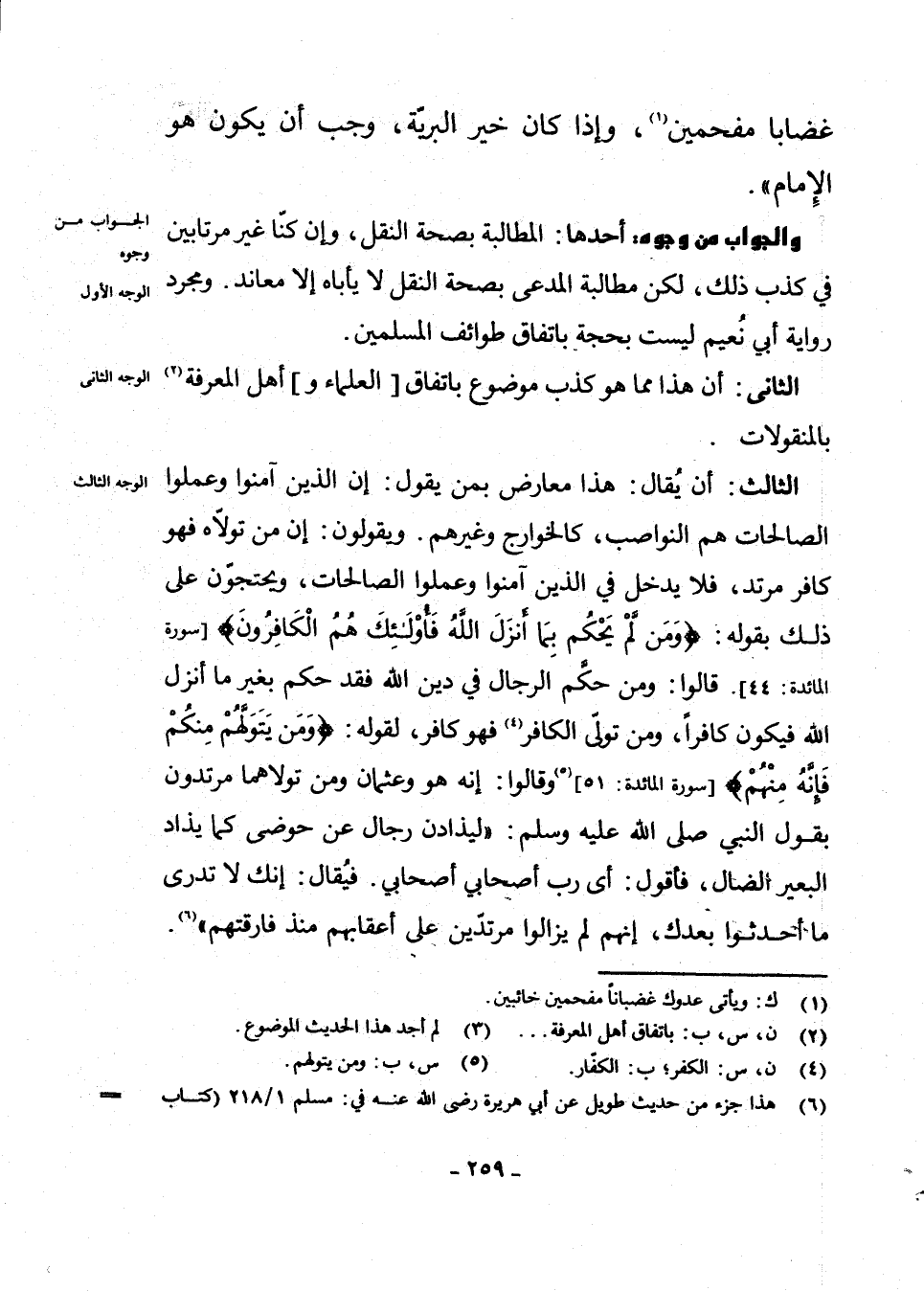 الثَّالِثُ: أَنْ يُقَالَ: هَذَا مُعَارَضٌ بِمَنْ يَقُولُ: إِنَّ الَّذِينَ آمَنُوا وَعَمِلُوا الصَّالِحَاتِ هُمُ النَّوَاصِبُ، كَالْخَوَارِجِ وَغَيْرِهِمْ (¬3) . وَيَقُولُونَ: إِنَّ مَنْ تَوَلَّاهُ فَهُوَ كَافِرٌ مُرْتَدٌّ، فَلَا يَدْخُلُ فِي الَّذِينَ آمَنُوا وَعَمِلُوا الصَّالِحَاتِ، وَيَحْتَجُّونَ عَلَى ذَلِكَ بِقَوْلِهِ: {وَمَنْ لَمْ يَحْكُمْ بِمَا أَنْزَلَ اللَّهُ فَأُولَئِكَ هُمُ الْكَافِرُونَ} [سُورَةُ الْمَائِدَةِ: 44] قَالُوا: وَمَنْ حَكَّمَ الرِّجَالَ فِي دِينِ اللَّهِ فَقَدْ حَكَمَ بِغَيْرِ مَا أَنْزَلَ اللَّهُ فَيَكُونُ كَافِرًا، وَمَنْ تَوَلَّى الْكَافِرَ (¬4) فَهُوَ كَافِرٌ ; لِقَوْلِهِ: {وَمَنْ يَتَوَلَّهُمْ مِنْكُمْ فَإِنَّهُ مِنْهُمْ} (¬5) وَقَالُوا: إِنَّهُ هُوَ وَعُثْمَانُ وَمَنْ تَوَلَّاهُمَا مُرْتَدُّونَ بِقَوْلِ النَّبِيِّ - صَلَّى اللَّهُ عَلَيْهِ وَسَلَّمَ -: " «لَيُذَادَنَّ رِجَالٌ عَنْ حَوْضِي كَمَا يُذَادُ الْبَعِيرُ الضَّالُّ، فَأَقُولُ: أَيْ رَبِّ أَصْحَابِي أَصْحَابِي. فَيُقَالُ: إِنَّكَ لَا تَدْرِي مَا أَحْدَثُوا بَعْدَكَ، إِنَّهُمْ لَمْ يَزَالُوا مُرْتَدِّينَ عَلَى أَعْقَابِهِمْ مُنْذُ فَارَقْتَهُمْ» " (¬6) .