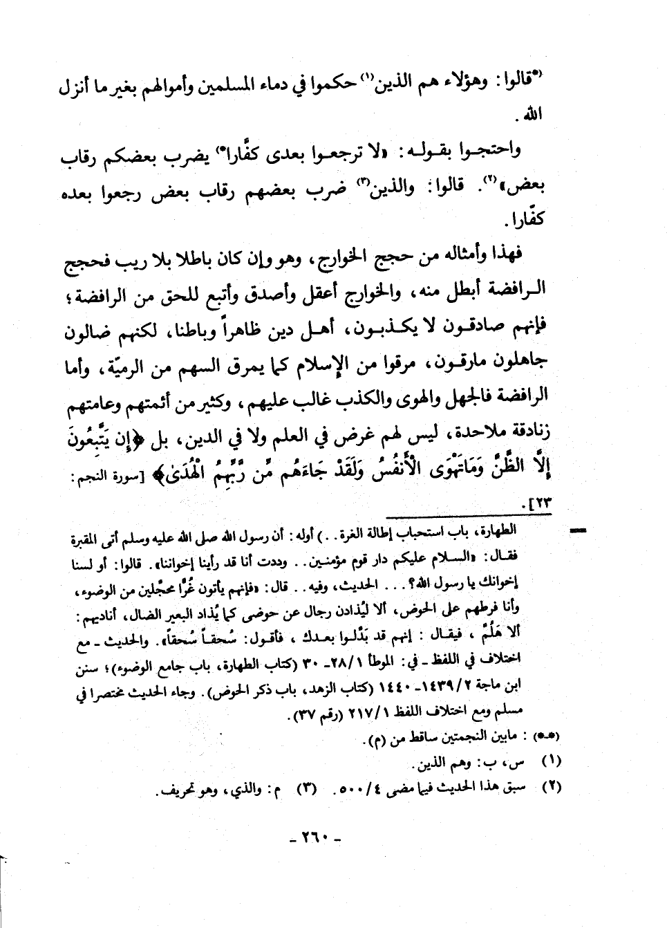 فَهَذَا وَأَمْثَالُهُ مِنْ حُجَجِ الْخَوَارِجِ، وَهُوَ وَإِنْ كَانَ بَاطِلًا بِلَا رَيْبٍ فَحُجَجُ الرَّافِضَةِ أَبْطَلُ مِنْهُ، وَالْخَوَارِجُ أَعْقَلُ وَأَصْدَقُ وَأَتْبَعُ لِلْحَقِّ مِنَ الرَّافِضَةِ ; فَإِنَّهُمْ صَادِقُونَ لَا يَكْذِبُونَ، أَهْلُ دِينٍ ظَاهِرًا وَبَاطِنًا، لَكِنَّهُمْ ضَالُّونَ جَاهِلُونَ مَارِقُونَ، مَرَقُوا مِنَ الْإِسْلَامِ كَمَا يَمْرُقُ السَّهْمُ مِنَ الرَّمِيَّةِ، وَأَمَّا الرَّافِضَةُ فَالْجَهْلُ وَالْهَوَى وَالْكَذِبُ غَالِبٌ عَلَيْهِمْ، وَكَثِيرٌ مِنْ أَئِمَّتِهِمْ وَعَامَّتِهِمْ زَنَادِقَةٌ مَلَاحِدَةٌ، لَيْسَ لَهُمْ غَرَضٌ فِي الْعِلْمِ وَلَا فِي الدِّينِ، بَلْ: {إِنْ يَتَّبِعُونَ إِلَّا الظَّنَّ وَمَا تَهْوَى الْأَنْفُسُ وَلَقَدْ جَاءَهُمْ مِنْ رَبِّهِمُ الْهُدَى} [سُورَةُ النَّجْمِ: 33] .
