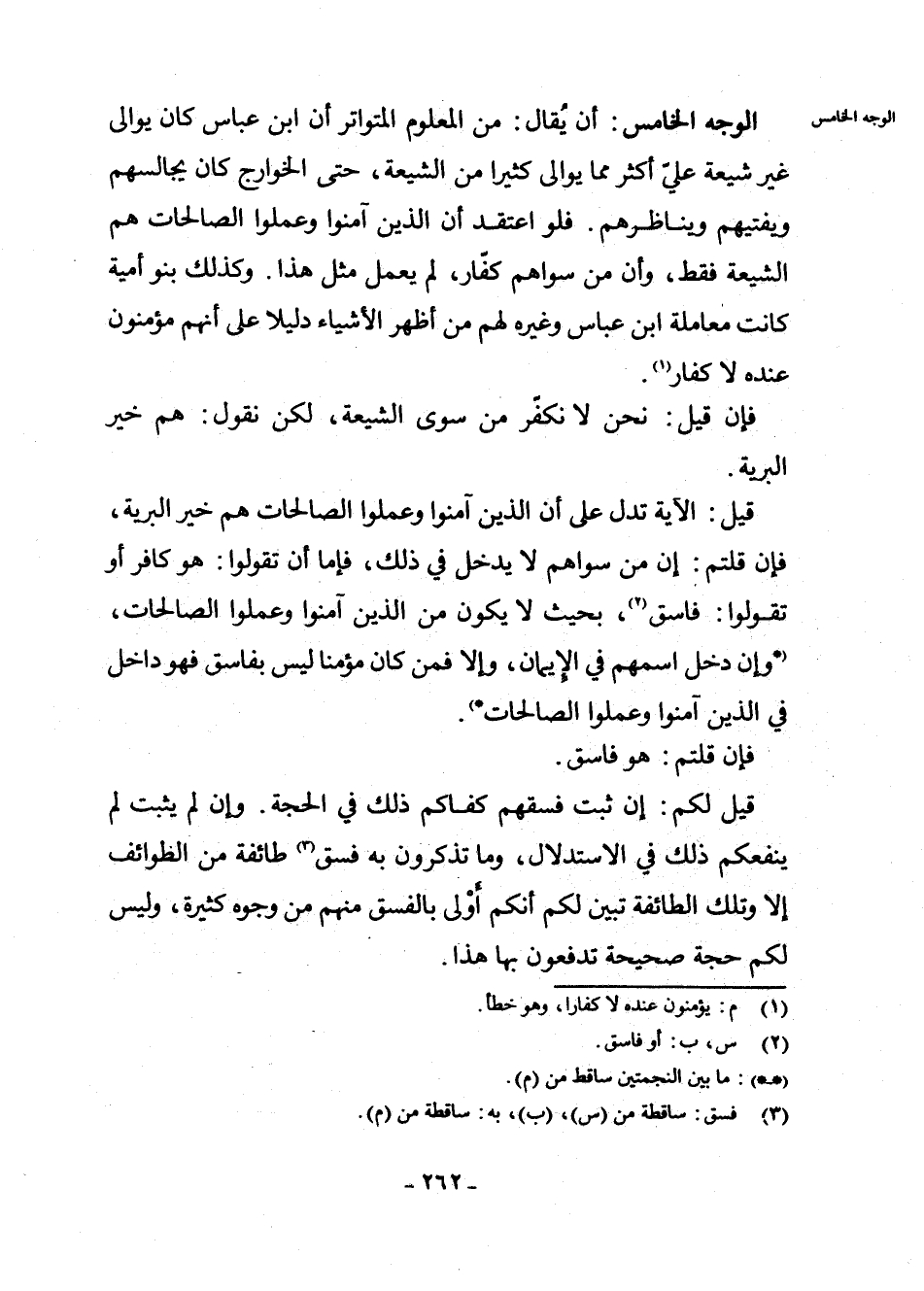 الْوَجْهُ الْخَامِسُ: أَنْ يُقَالَ: مِنَ الْمَعْلُومِ الْمُتَوَاتِرِ أَنَّ ابْنَ عَبَّاسٍ كَانَ يُوَالِي غَيْرَ شِيعَةِ عَلِيٍّ أَكْثَرَ مِمَّا يُوَالِي كَثِيرًا مِنَ الشِّيعَةِ، حَتَّى الْخَوَارِجُ كَانَ يُجَالِسُهُمْ وَيُفْتِيهِمْ وَيُنَاظِرُهُمْ. فَلَوِ اعْتَقَدَ أَنَّ الَّذِينَ آمَنُوا وَعَمِلُوا الصَّالِحَاتِ هُمُ الشِّيعَةُ فَقَطْ، وَأَنَّ مَنْ سِوَاهُمْ كُفَّارٌ، لَمْ يَعْمَلْ مِثْلَ هَذَا. وَكَذَلِكَ بَنُو أُمَيَّةَ كَانَتْ مُعَامَلَةُ ابْنِ عَبَّاسٍ وَغَيْرِهِ لَهُمْ مِنْ أَظْهَرِ الْأَشْيَاءِ دَلِيلًا عَلَى أَنَّهُمْ مُؤْمِنُونَ عِنْدَهُ لَا كُفَّارٌ (¬1) .