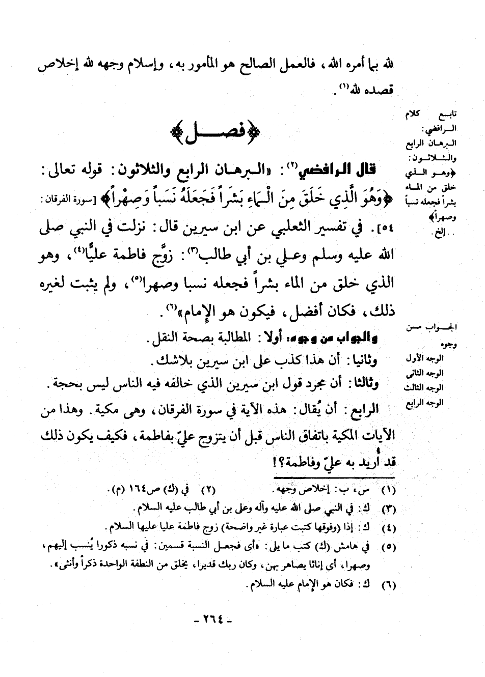 قَالَ الرَّافِضِيُّ (¬2) : " الْبُرْهَانُ الرَّابِعُ وَالثَّلَاثُونَ: قَوْلُهُ تَعَالَى: {وَهُوَ الَّذِي خَلَقَ مِنَ الْمَاءِ بَشَرًا فَجَعَلَهُ نَسَبًا وَصِهْرًا} [سُورَةُ الْفُرْقَانِ: 54] وَفِي تَفْسِيرِ الثَّعْلَبِيِّ عَنِ ابْنِ سِيرِينَ قَالَ: نَزَلَتْ فِي النَّبِيِّ - صَلَّى اللَّهُ عَلَيْهِ وَسَلَّمَ - وَعَلِيِّ بْنِ أَبِي طَالِبٍ (¬3) : زَوَّجَ فَاطِمَةَ عَلِيًّا (¬4) ، وَهُوَ الَّذِي خَلَقَ مِنَ الْمَاءِ بَشَرًا فَجَعَلَهُ نَسَبًا وَصِهْرًا (¬5) ، وَلَمْ يَثْبُتْ لِغَيْرِهِ ذَلِكَ، فَكَانَ أَفْضَلَ، فَيَكُونُ هُوَ الْإِمَامَ " (¬6) .