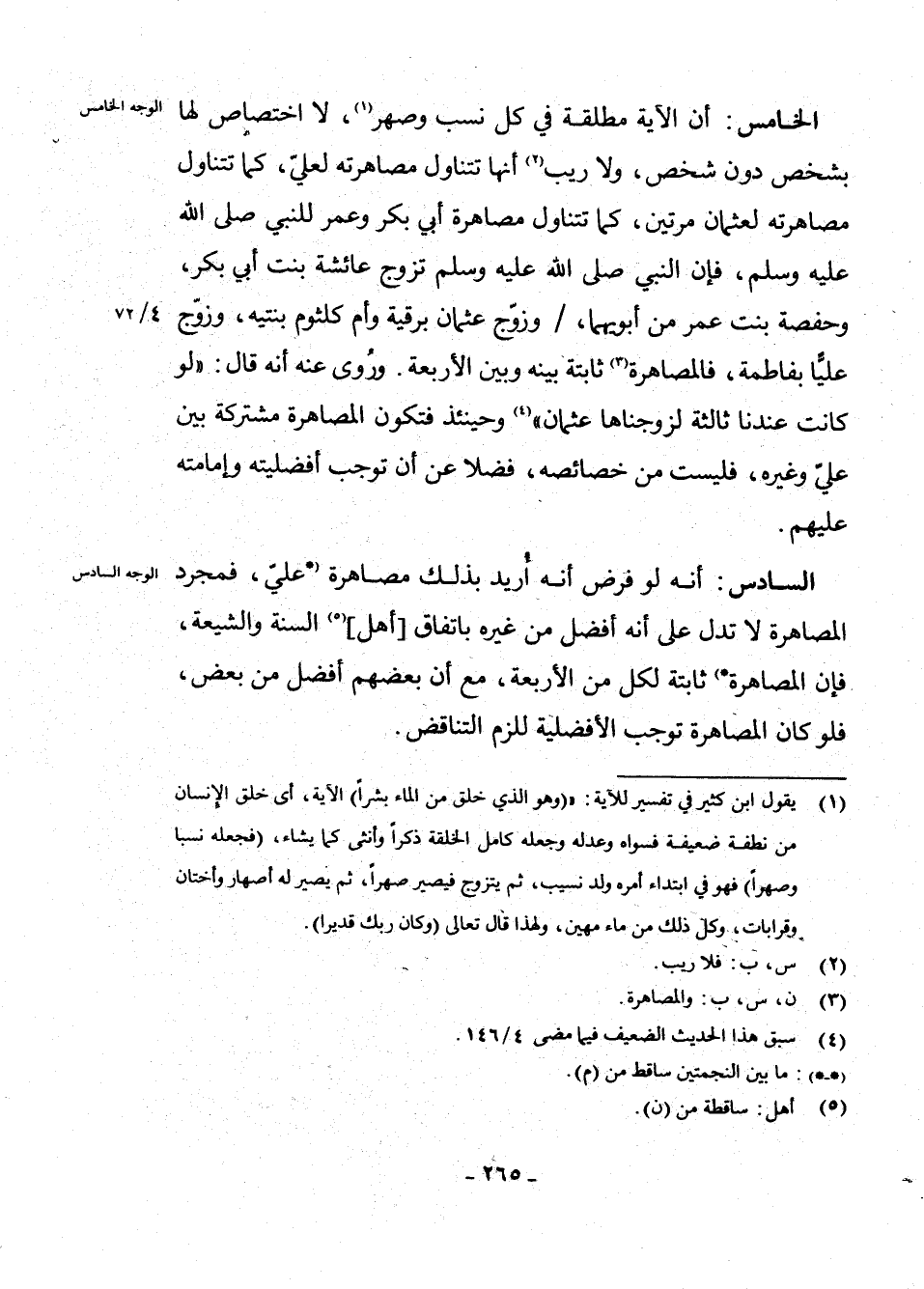 الْخَامِسُ: أَنَّ الْآيَةَ مُطْلَقَةٌ فِي كُلِّ نَسَبٍ وَصِهْرٍ (¬1) ، لَا اخْتِصَاصَ لَهَا بِشَخْصٍ دُونَ شَخْصٍ، وَلَا رَيْبَ (¬2) أَنَّهَا تَتَنَاوَلُ مُصَاهَرَتَهُ لِعَلِيٍّ، كَمَا تَتَنَاوَلُ مُصَاهَرَتَهُ لِعُثْمَانَ مَرَّتَيْنِ، كَمَا تَتَنَاوَلُ مُصَاهَرَةَ أَبِي بَكْرٍ وَعُمَرَ لِلنَّبِيِّ - صَلَّى اللَّهُ عَلَيْهِ وَسَلَّمَ -، فَإِنَّ النَّبِيَّ - صَلَّى اللَّهُ عَلَيْهِ وَسَلَّمَ - تَزَوُّجَ عَائِشَةَ بِنْتَ أَبِي بَكْرٍ، وَحَفْصَةَ بِنْتَ عُمَرَ - مِنْ أَبَوَيْهِمَا، وَزَوَّجَ عُثْمَانَ بِرُقَيَّةَ، وَأُمَّ كُلْثُومٍ بِنْتَيْهِ، وَزَوَّجَ عَلِيًّا بِفَاطِمَةَ، فَالْمُصَاهَرَةُ (¬3) ثَابِتَةٌ بَيْنَهُ وَبَيْنَ الْأَرْبَعَةِ. وَرُوِيَ عَنْهُ أَنَّهُ قَالَ: " «لَوْ كَانَتْ عِنْدَنَا ثَالِثَةٌ لَزَوَّجْنَاهَا عُثْمَانَ» " (¬4) وَحِينَئِذٍ فَتَكُونُ الْمُصَاهَرَةُ مُشْتَرَكَةٌ بَيْنَ عَلِيٍّ وَغَيْرِهِ، فَلَيْسَتْ مِنْ خَصَائِصِهِ، فَضْلًا عَنْ أَنْ تُوجِبَ أَفْضَلِيَّتَهُ وَإِمَامَتَهُ عَلَيْهِمْ.