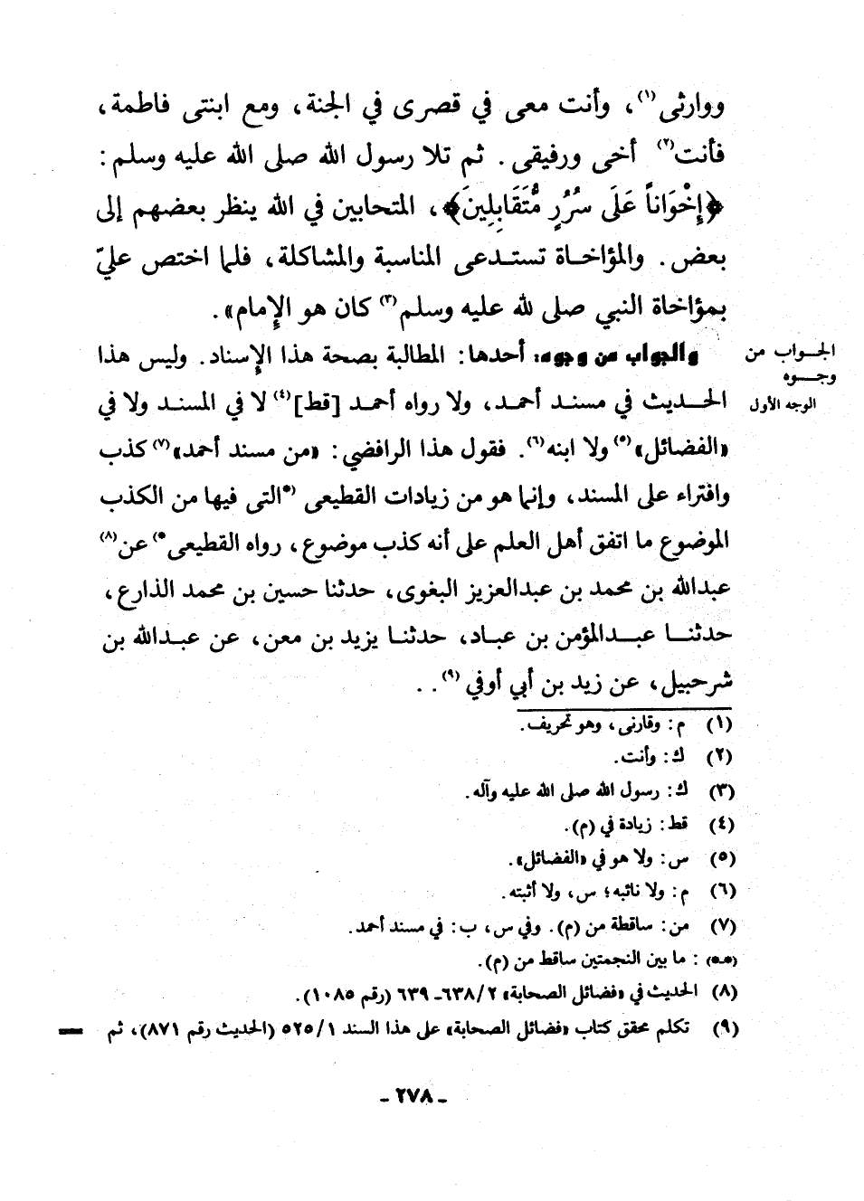وَالْجَوَابُ مِنْ وُجُوهٍ: أَحَدُهَا: الْمُطَالَبَةُ بِصِحَّةِ هَذَا الْإِسْنَادِ. وَلَيْسَ هَذَا الْحَدِيثُ فِي مُسْنَدِ أَحْمَدَ، وَلَا رَوَاهُ أَحْمَدُ [قَطُّ] (¬4) لَا فِي الْمُسْنَدِ وَلَا فِي " الْفَضَائِلِ (¬5) " وَلَا ابْنُهُ (¬6) . فَقَوْلُ هَذَا الرَّافِضِيِّ: " مِنْ مُسْنَدِ أَحْمَدَ " (¬7) كَذِبٌ وَافْتِرَاءٌ عَلَى الْمُسْنَدِ، وَإِنَّمَا هُوَ مِنْ زِيَادَاتِ الْقَطِيعِيِّ * الَّتِي فِيهَا مِنَ الْكَذِبِ الْمَوْضُوعِ مَا اتَّفَقَ أَهْلُ الْعِلْمِ عَلَى أَنَّهُ كَذِبٌ مَوْضُوعٌ، رَوَاهُ الْقَطِيعِيُّ * (¬8) عَنْ (¬9) عَبْدِ اللَّهِ بْنِ مُحَمَّدِ بْنِ عَبْدِ الْعَزِيزِ الْبَغَوِيِّ، حَدَّثَنَا حُسَيْنُ بْنُ مُحَمَّدٍ الذَّارِعُ، حَدَّثَنَا عَبْدُ الْمُؤْمِنِ بْنُ عَبَّادٍ، حَدَّثَنَا يَزِيدُ بْنُ مَعْنٍ، عَنْ عَبْدِ اللَّهِ بْنِ شُرَحْبِيلَ، عَنْ زَيْدِ بْنِ أَبِي أَوْفَى (¬10) .
