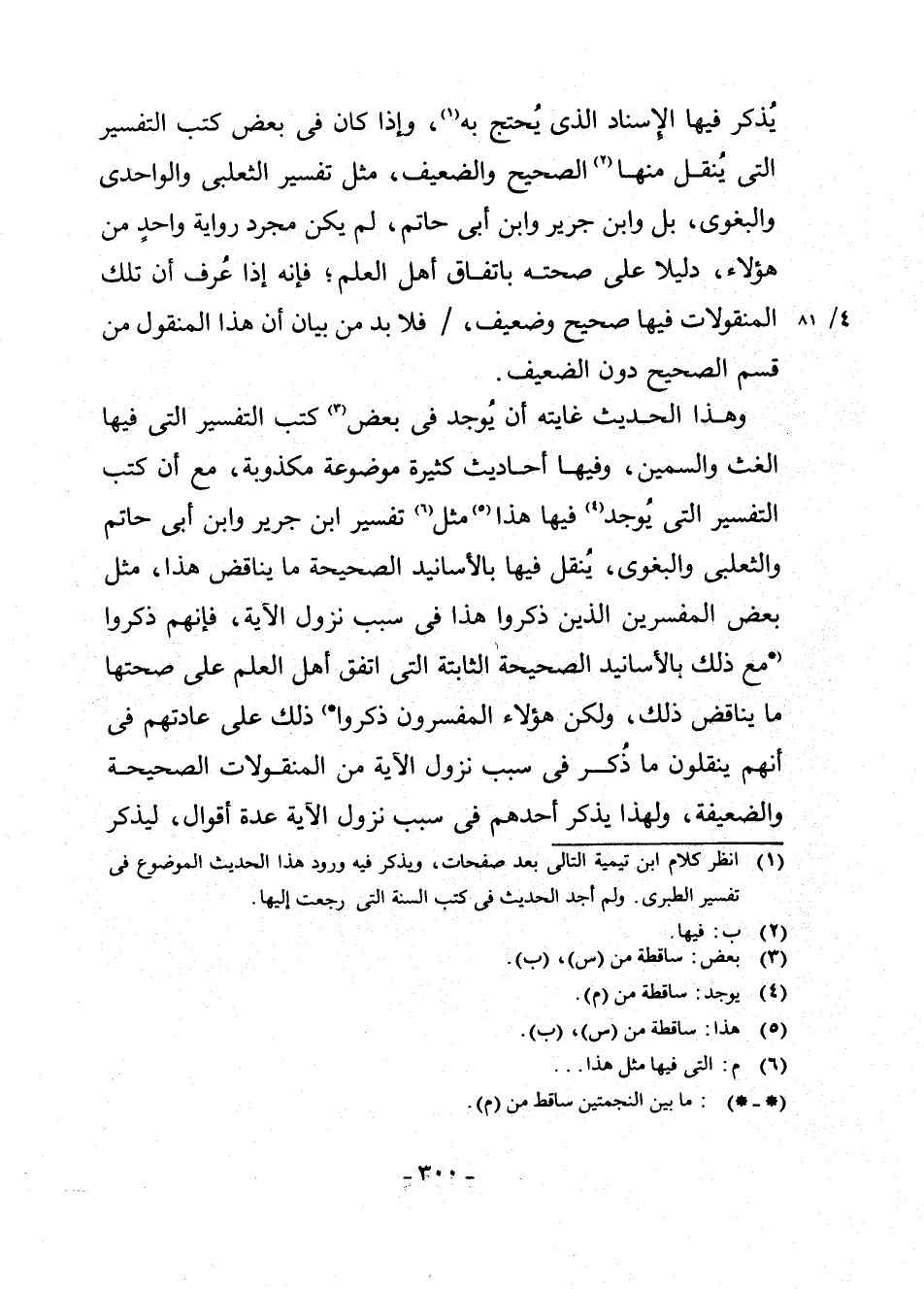 يُذْكَرُ فِيهَا الْإِسْنَادُ الَّذِي يُحْتَجُّ بِهِ (¬1) .، وَإِذَا كَانَ فِي بَعْضِ كُتُبِ التَّفْسِيرِ الَّتِي يُنْقَلُ مِنْهَا (¬2) . الصَّحِيحُ وَالضَّعِيفُ، مِثْلِ تَفْسِيرِ الثَّعْلَبِيِّ وَالْوَاحِدِيِّ وَالْبَغَوِيِّ، بَلْ وَابْنِ جَرِيرٍ وَابْنِ أَبِي حَاتِمٍ، لَمْ يَكُنْ مُجَرَّدُ رِوَايَةِ وَاحِدٍ مِنْ هَؤُلَاءِ دَلِيلًا عَلَى صِحَّتِهِ بِاتِّفَاقِ أَهْلِ الْعِلْمِ ; فَإِنَّهُ إِذَا عُرِفَ أَنَّ تِلْكَ الْمَنْقُولَاتِ فِيهَا صَحِيحٌ وَضَعِيفٌ، فَلَا بُدَّ مِنْ بَيَانِ أَنَّ هَذَا الْمَنْقُولَ مِنْ قِسْمِ الصَّحِيحِ دُونَ الضَّعِيفِ.